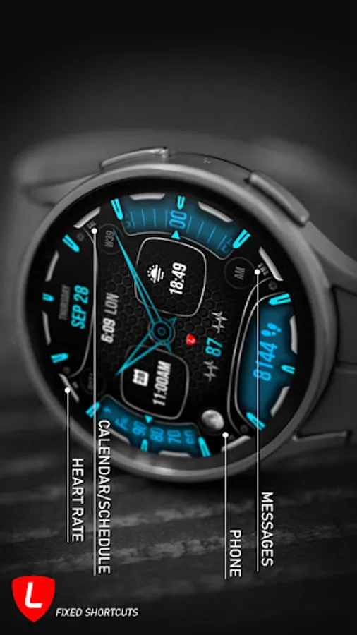 ✦ Benefit from fixed links that provide quick access to essential applications: [TEL] opens the Phone app, [SMS] launches the Messages app, [CAL] opens the Calendar app and [HR] directs you to the Heart Rate app.