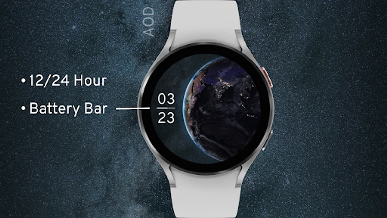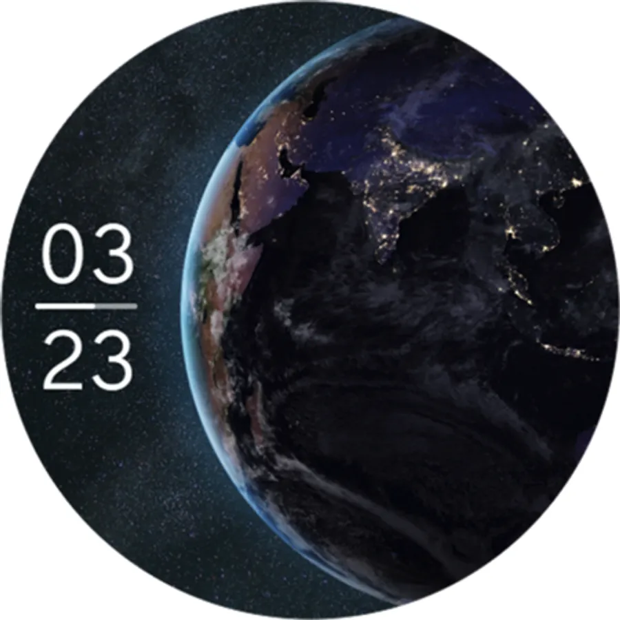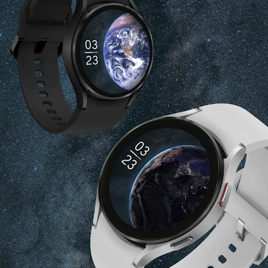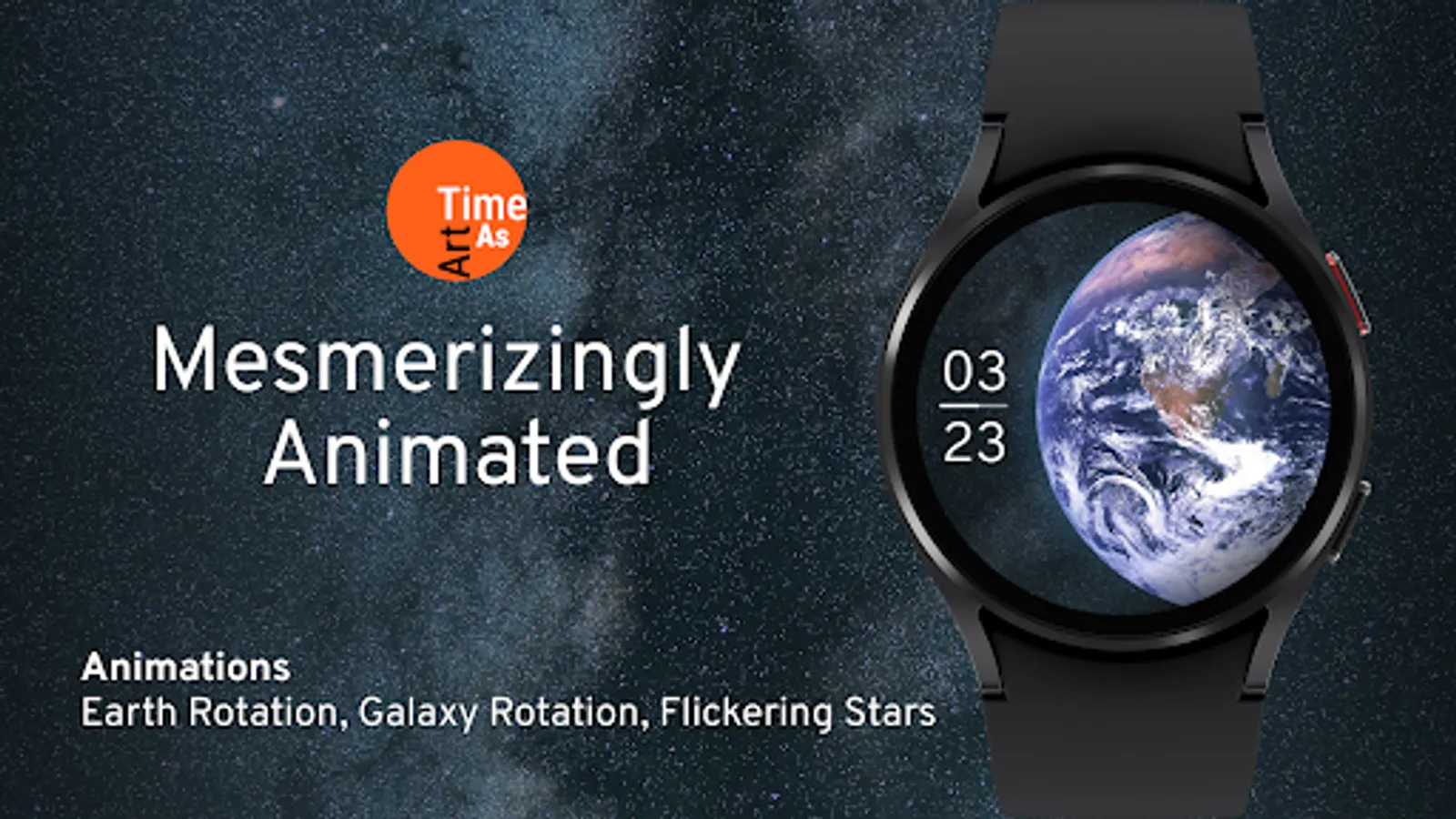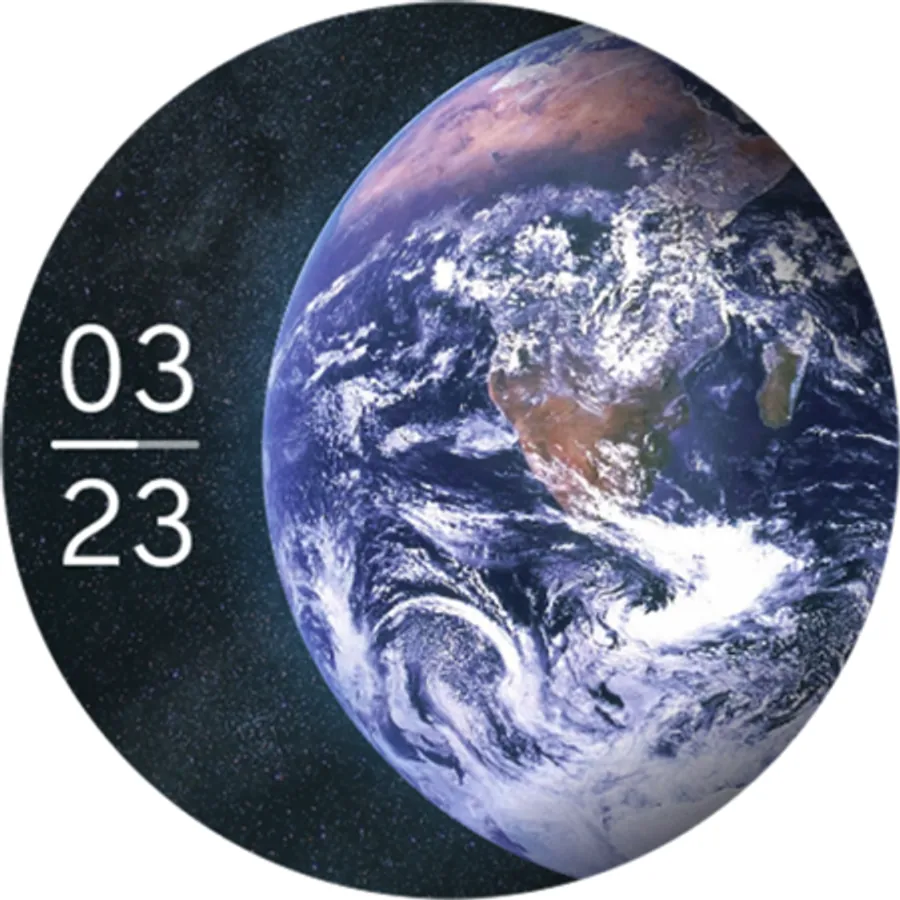Mesmerizingly animated watch face of earth, galaxy rotation and flickering stars. Astronauts in space often describe 'Looking Back' at earth as earth gazing.