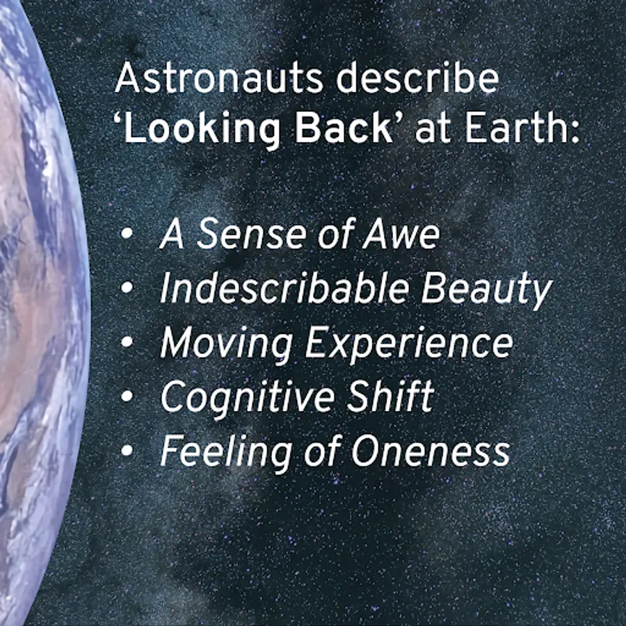 Astronauts describe this experience as the 'Overview Effect' - a powerful realization of earth's indescribable but fragile beauty, a realization of feeling the unity and oneness of all life on earth, of a cognitive shift in seeing earth as our home, as an oasis against the backdrop of infinity.