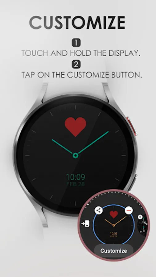 - To customize your watch face, simply touch and hold the display, then tap on the Customize button.