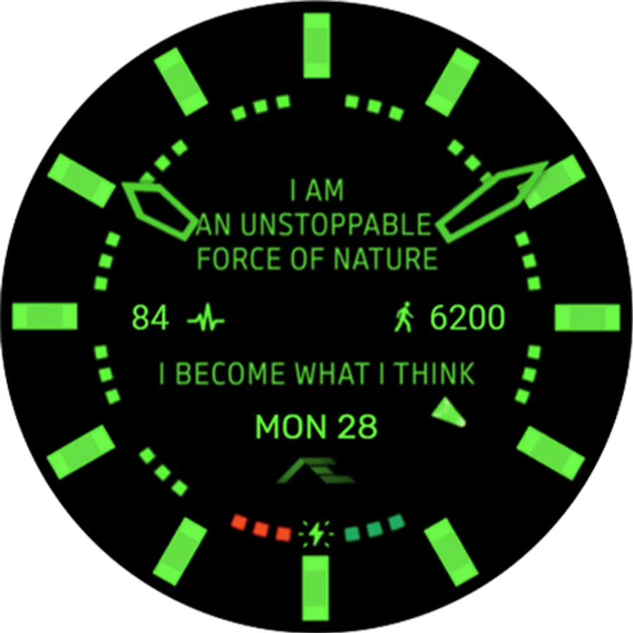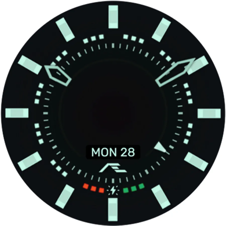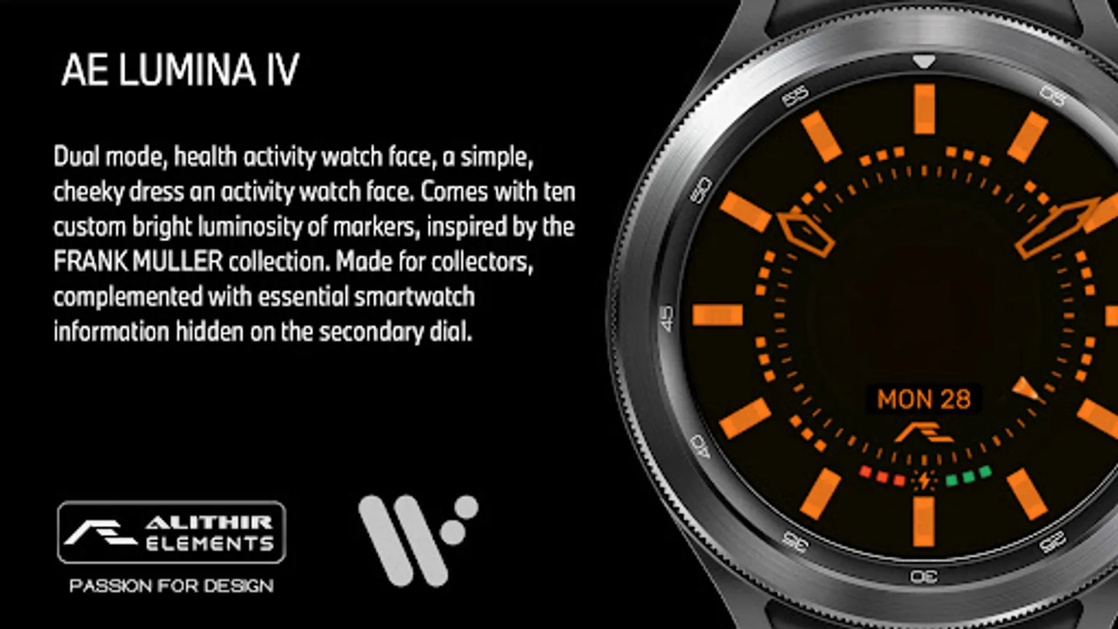 Dual mode, a simple, cheeky dress an activity watch face. Comes with ten custom bright luminosity of markers, inspired by the FRANK MULLER collection. Made for collectors, complemented with essential smartwatch information hidden on the secondary dial.