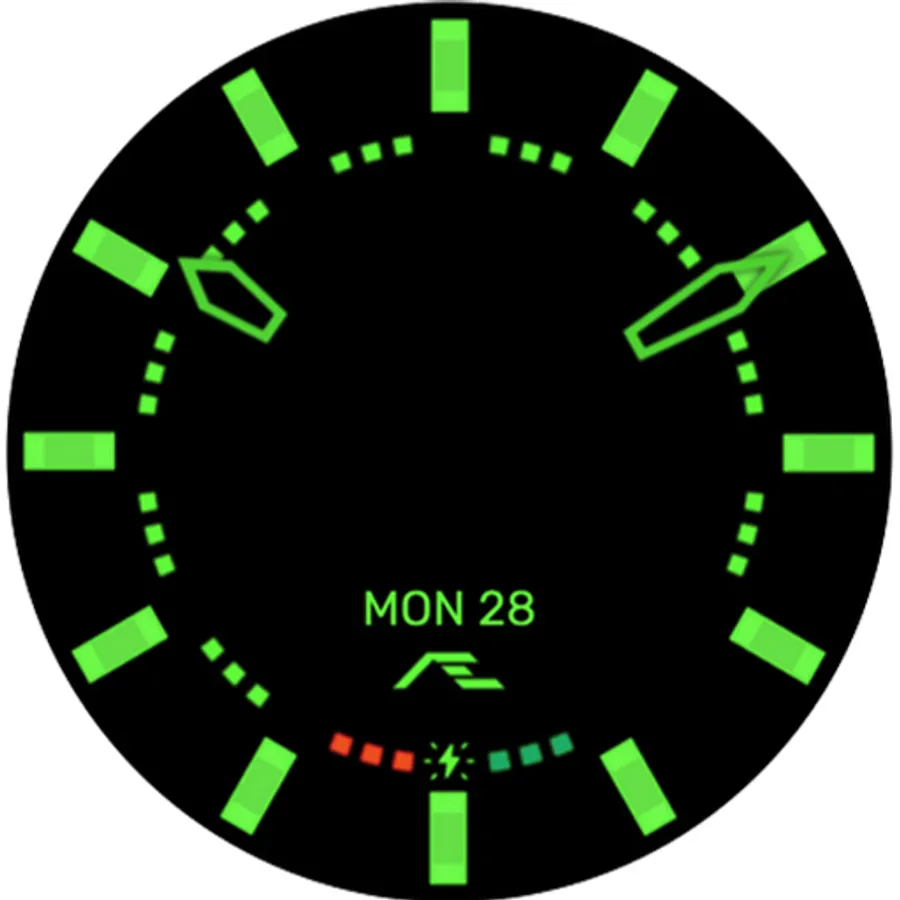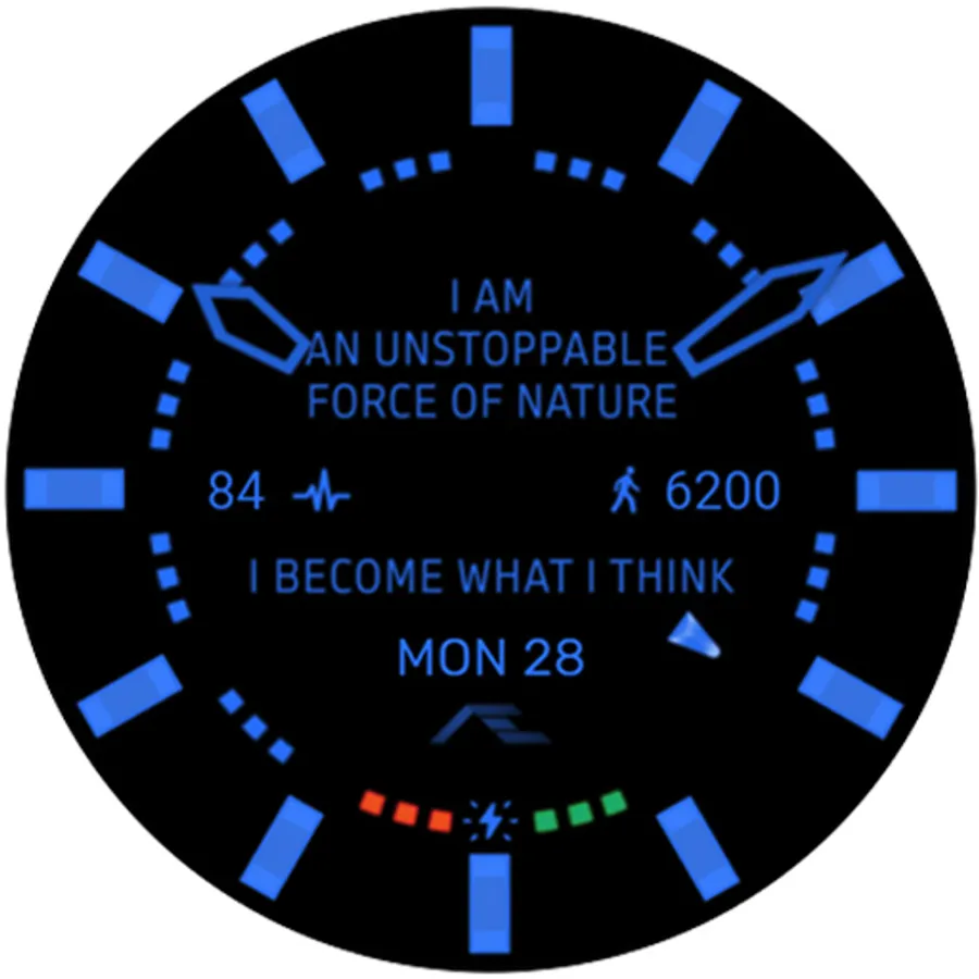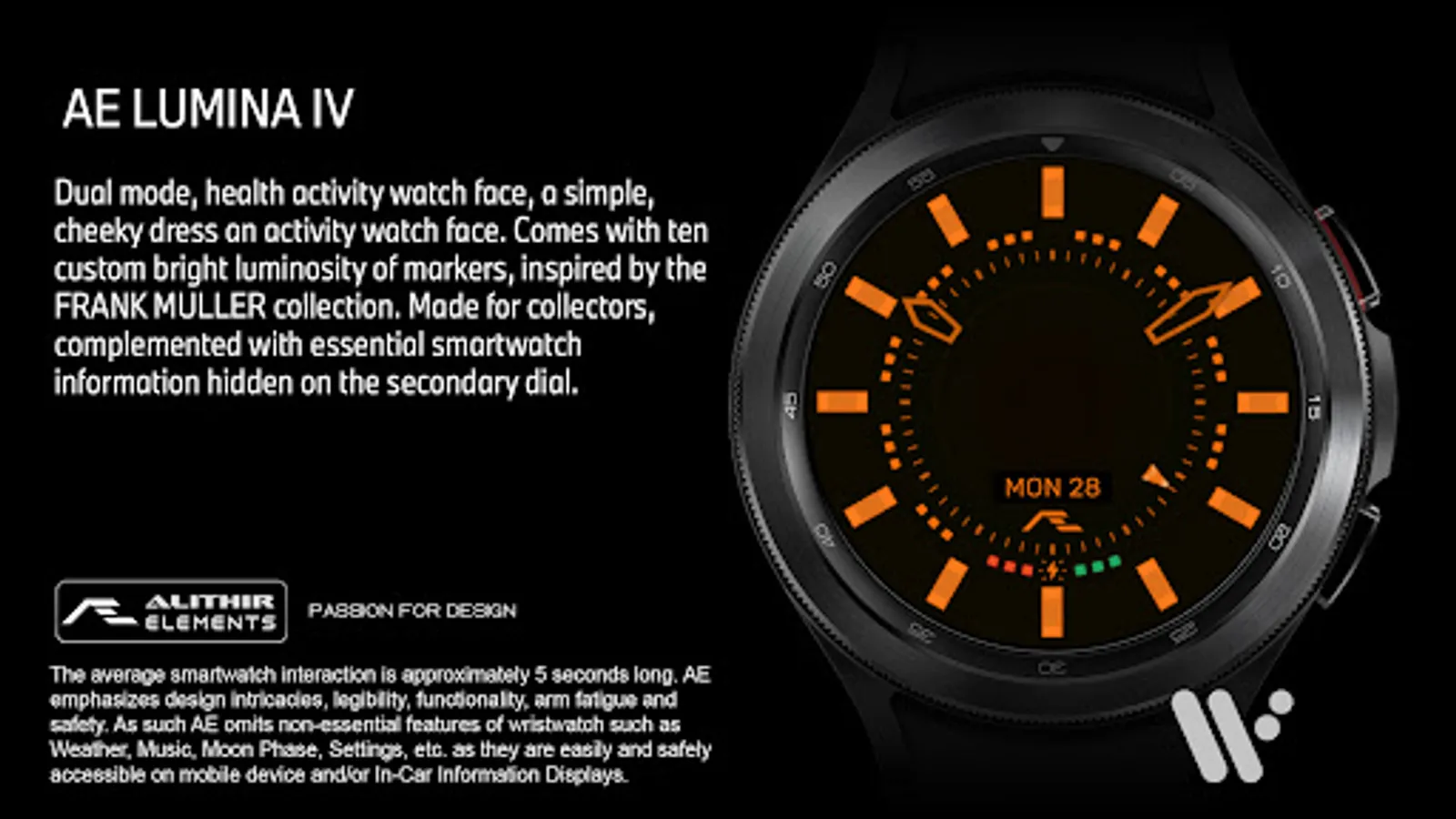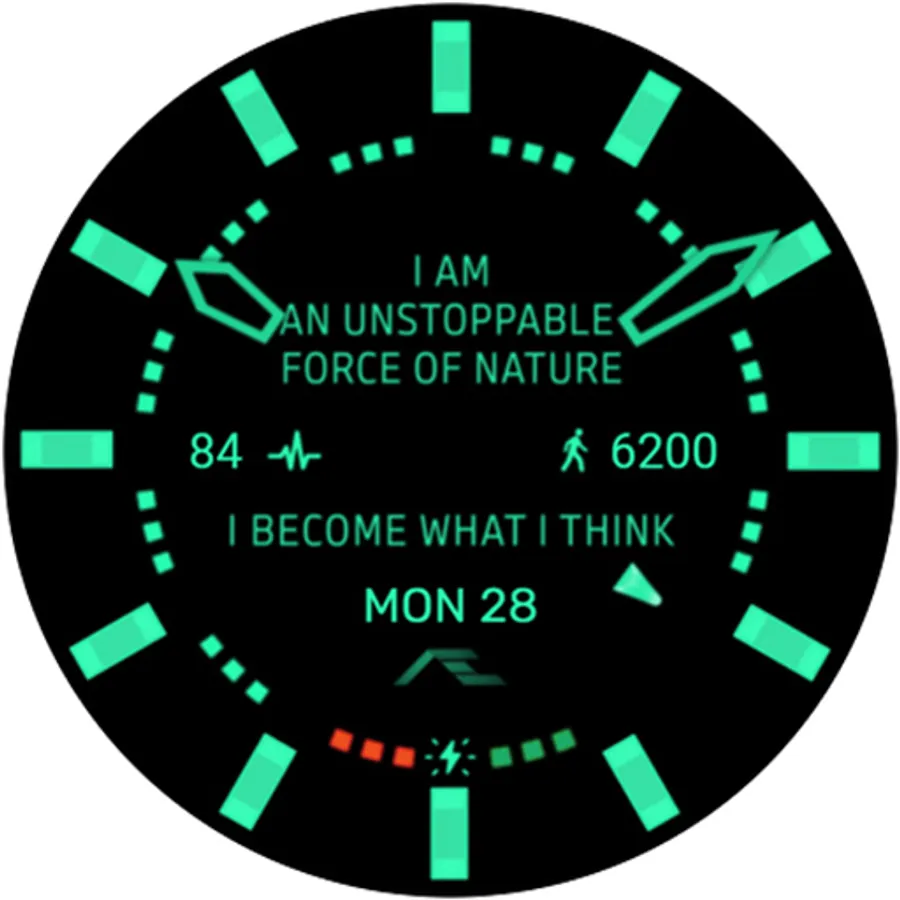 Dual mode, a simple, cheeky dress an activity watch face. Comes with ten custom bright luminosity of markers, inspired by the FRANK MULLER collection. Made for collectors, complemented with essential smartwatch information hidden on the secondary dial.