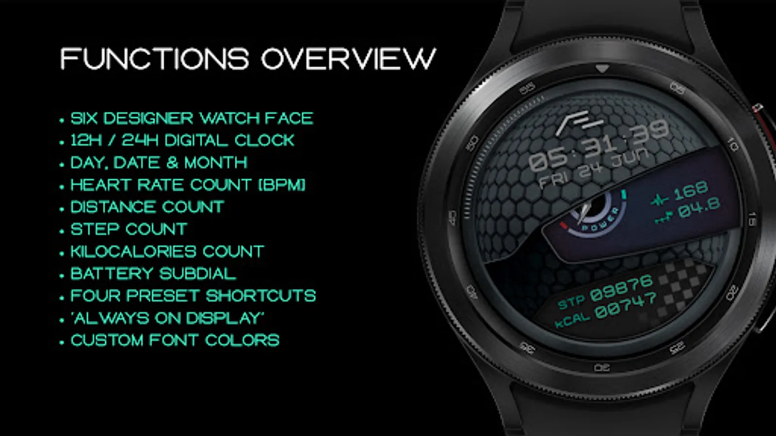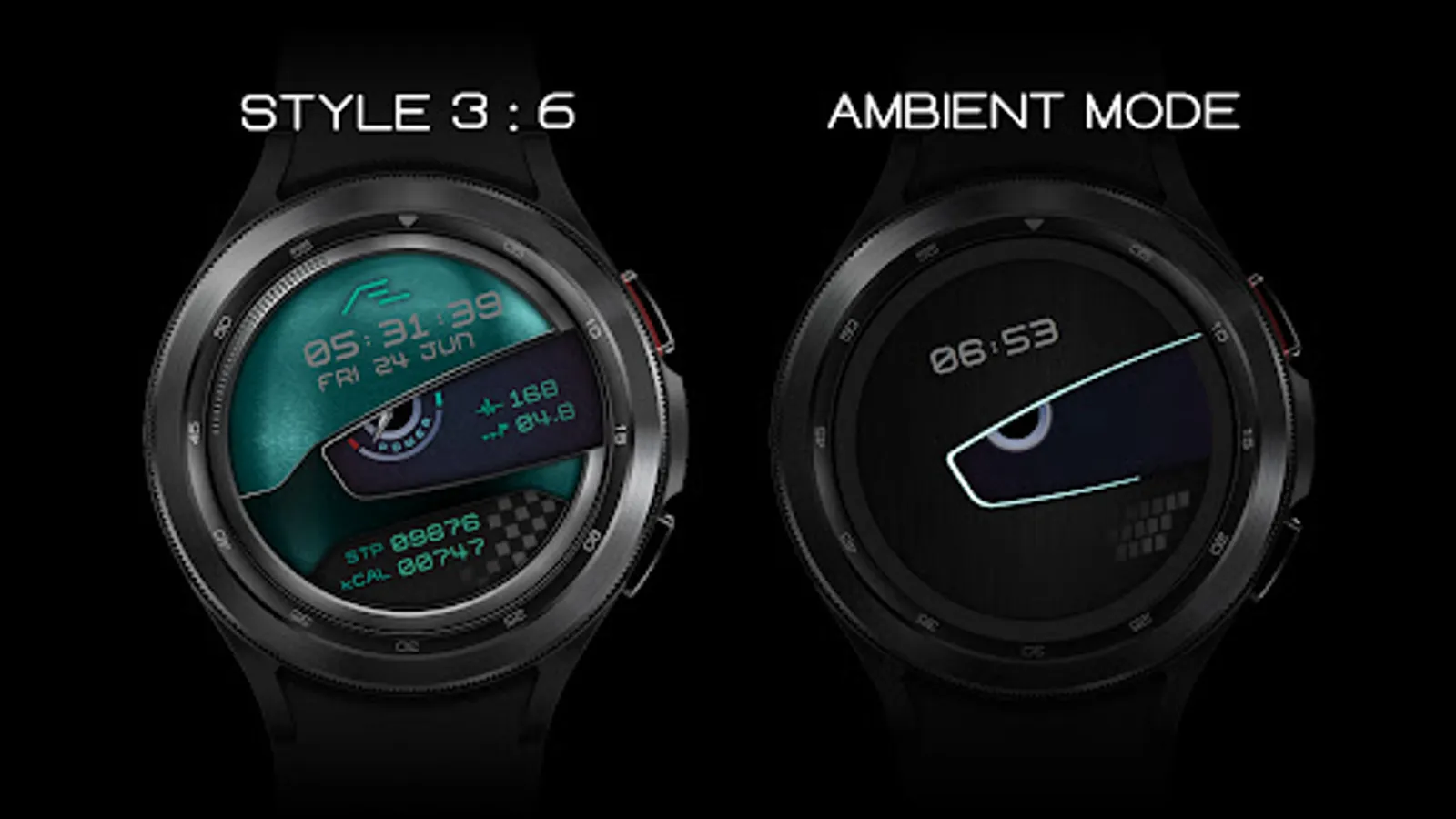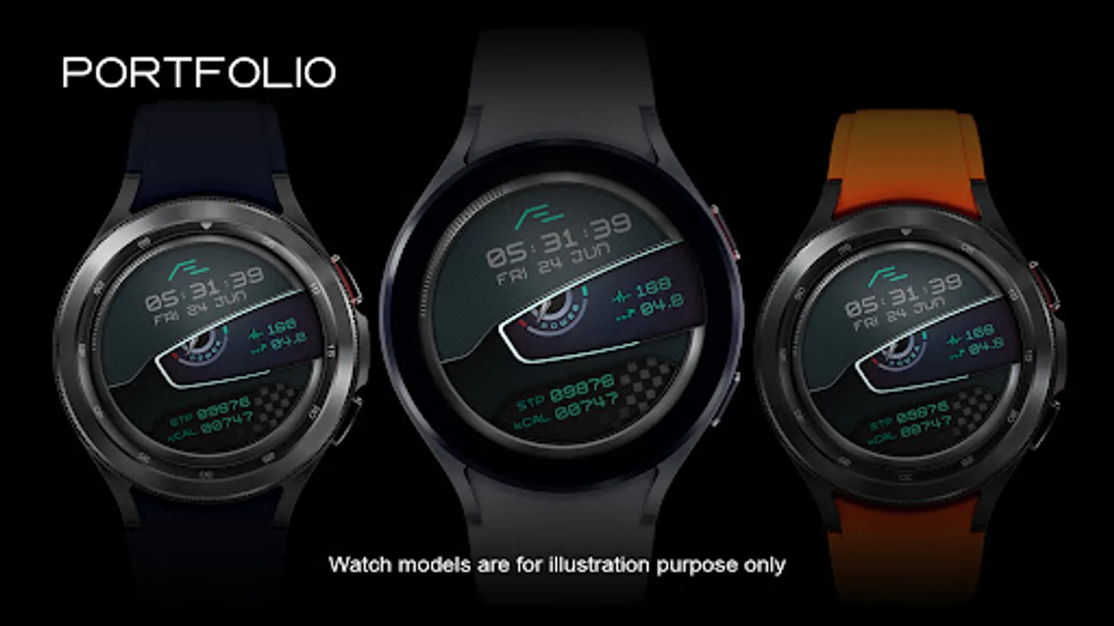 Motorsport inspired health activity tracking watch face. Six dial choices, customizable font colors and a simple yet artistic ‘Always On Display’.