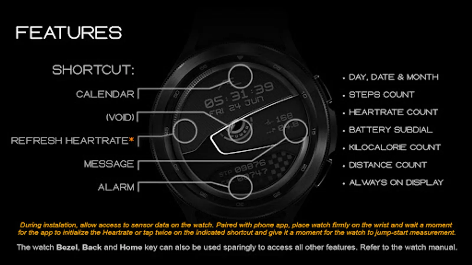 *Attention to Google Play Team. During installation, allow access to sensor data on the watch. Paired with phone app, place watch firmly on the wrist and wait a moment for the app to initialize the Heartrate or tap twice on the indicated shortcut and give the watch a moment to jump-start measurement.