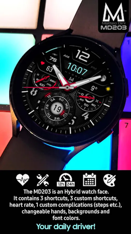 It contains 3 Preset App shortcuts, 3 customizable shortcuts, 1 customizable complications where you can enter the data you prefer such as "steps", "weather" (etc.), heart rate, changeable colors and more.