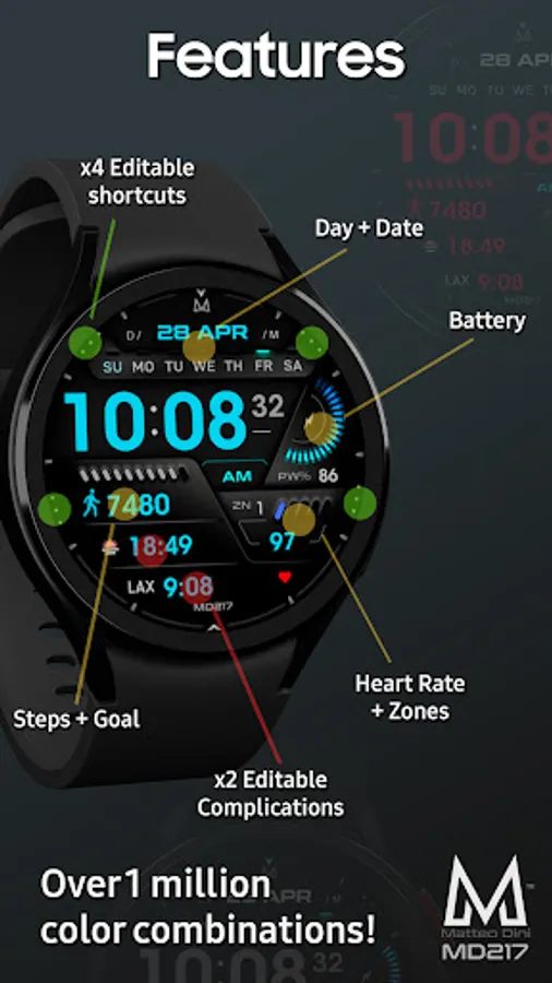 - Changeable colors of background, hour, minutes, seconds, date + AOD mininal style,