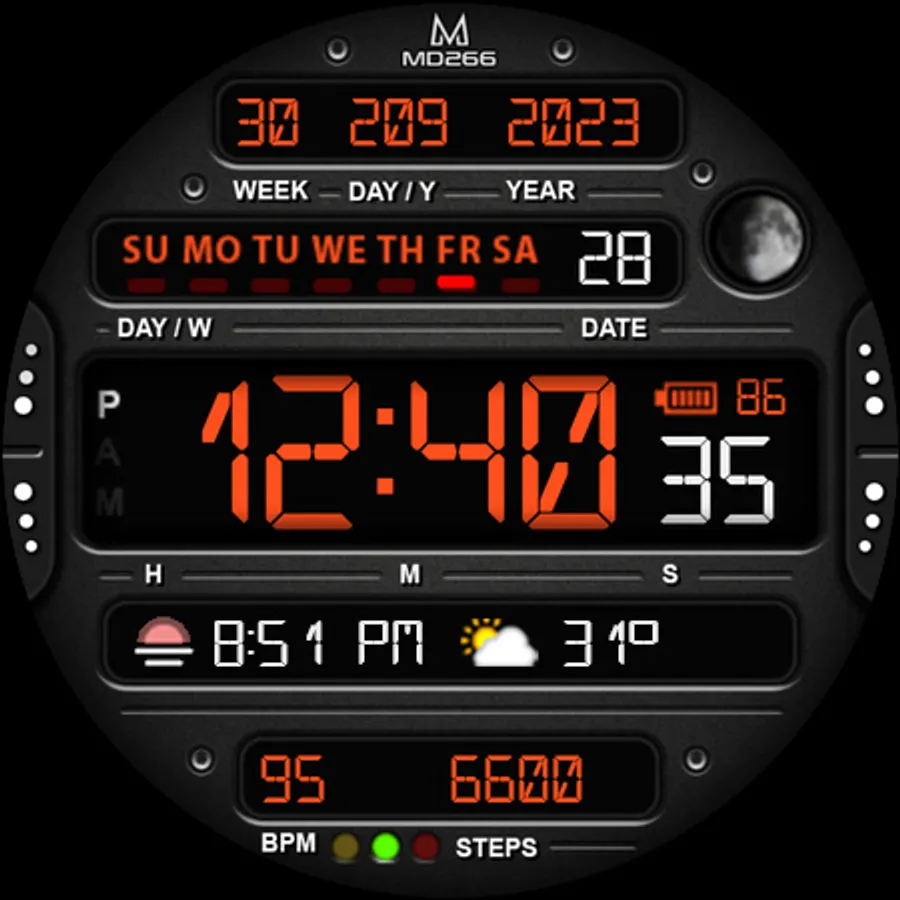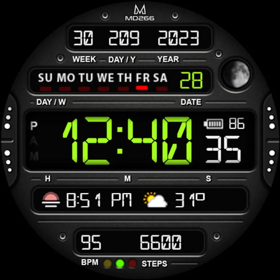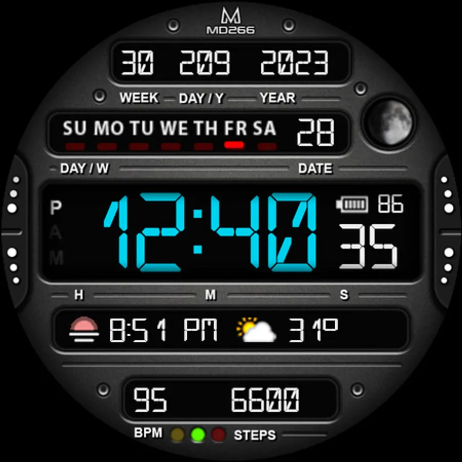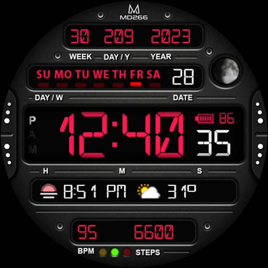 The MD266 is a digital watch face for Wear OS with many customizations.