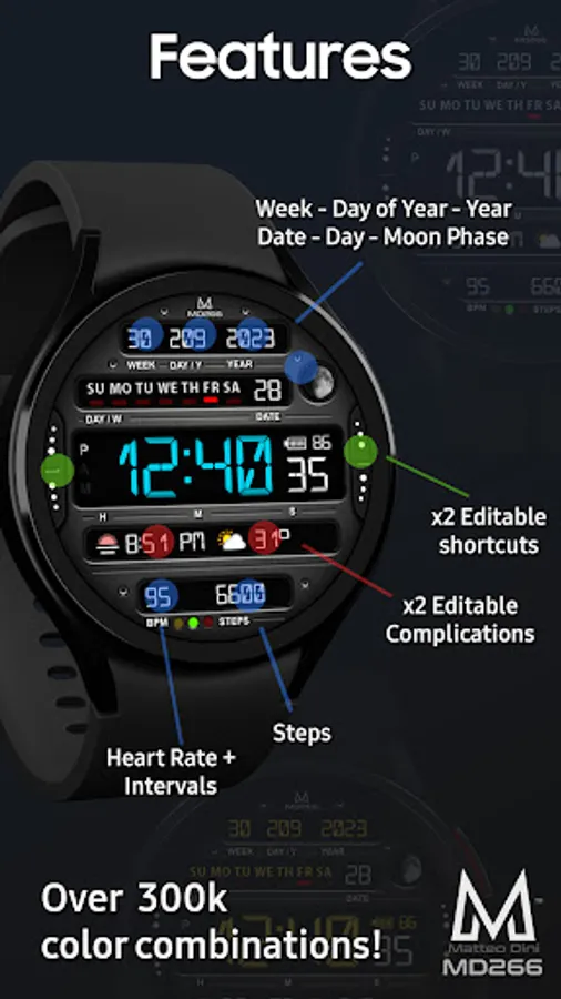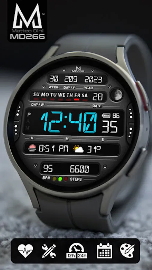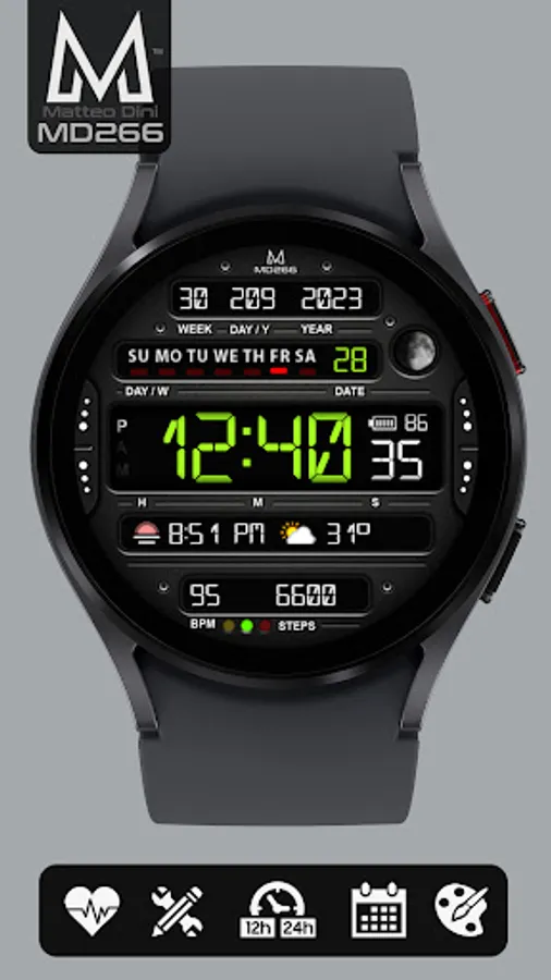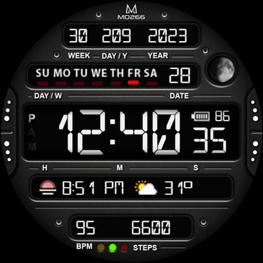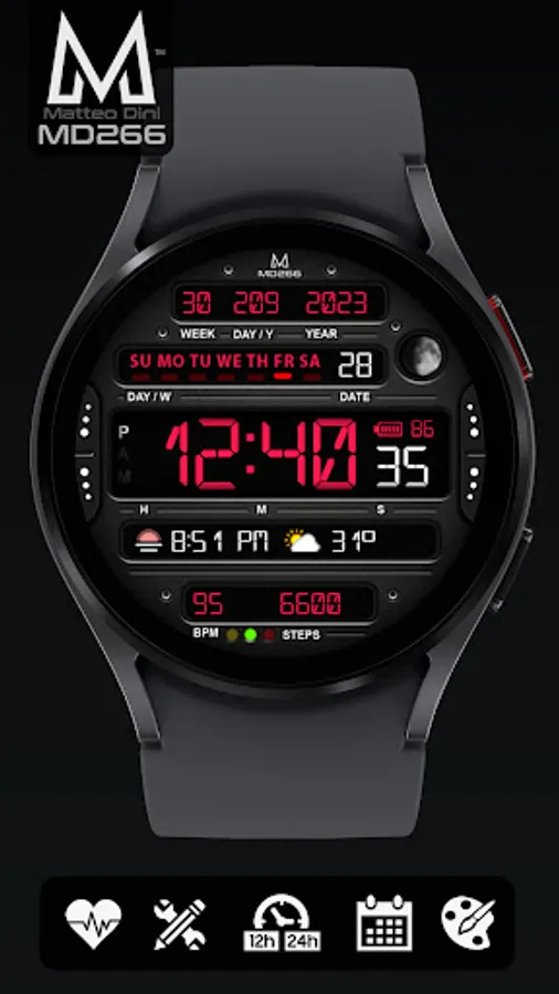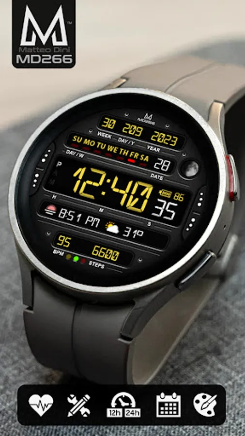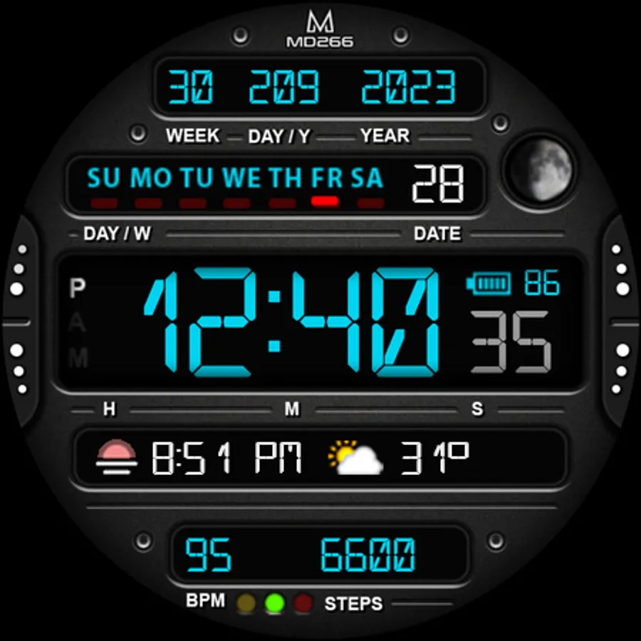 The MD266 is a digital watch face for Wear OS with many customizations.