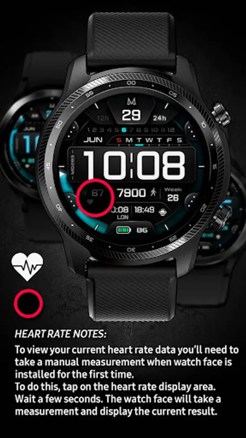 To view your current heart rate data you’ll need to take a manual measurement. To do this, tap on the heart rate display area (see images). Wait a few seconds. The watch face will take a measurement and display the current result.