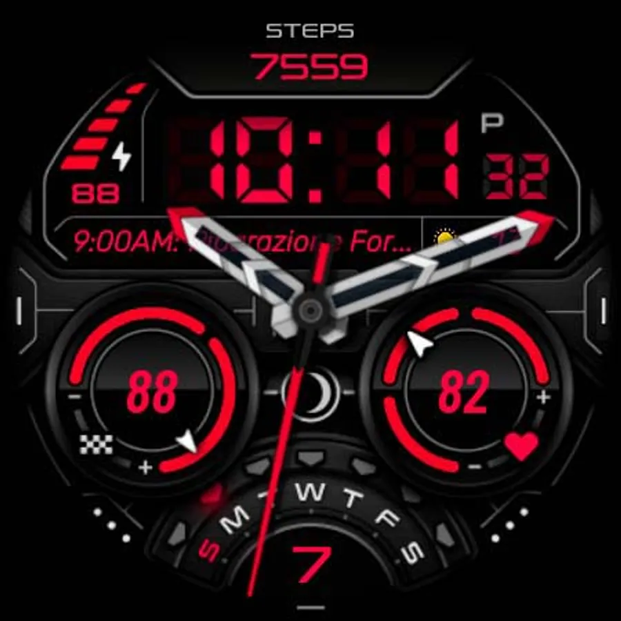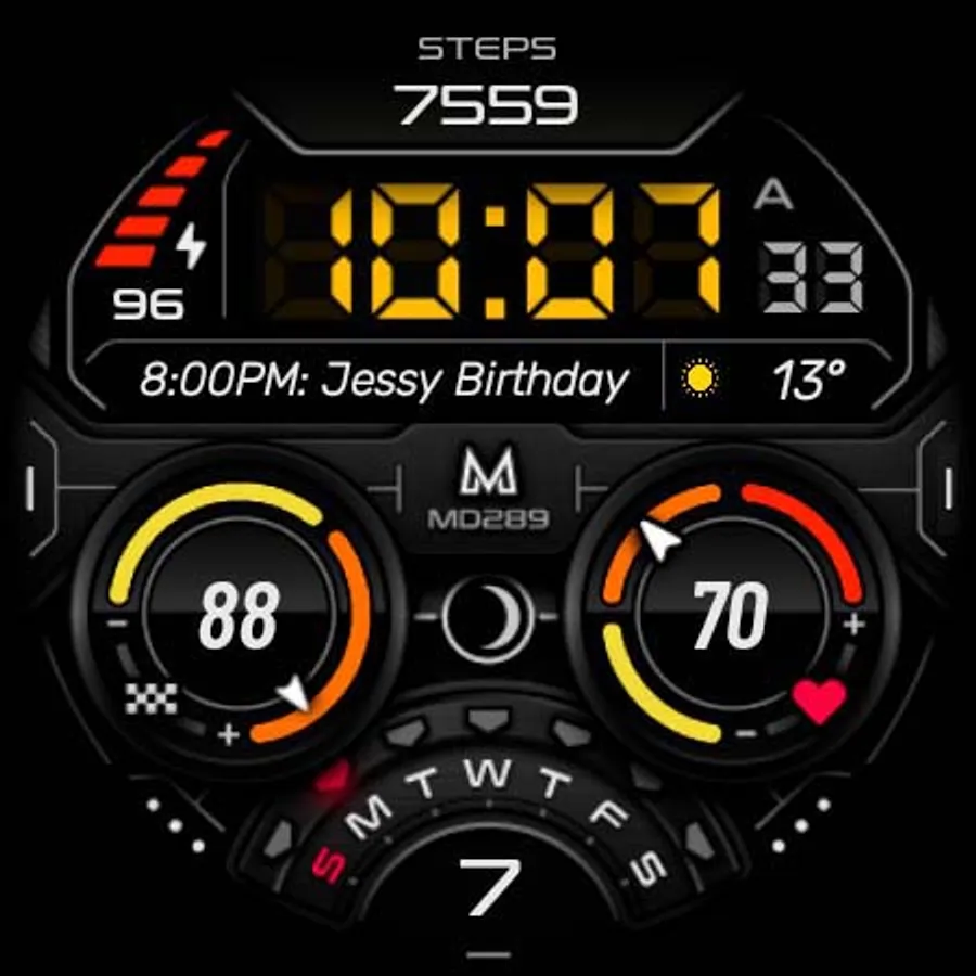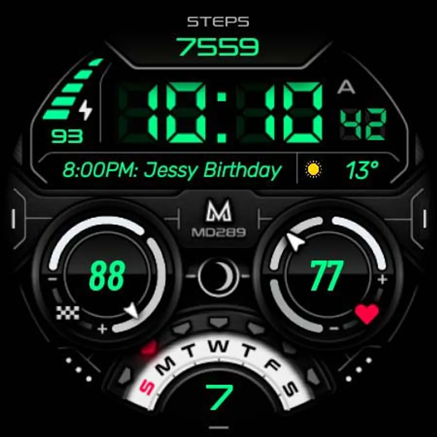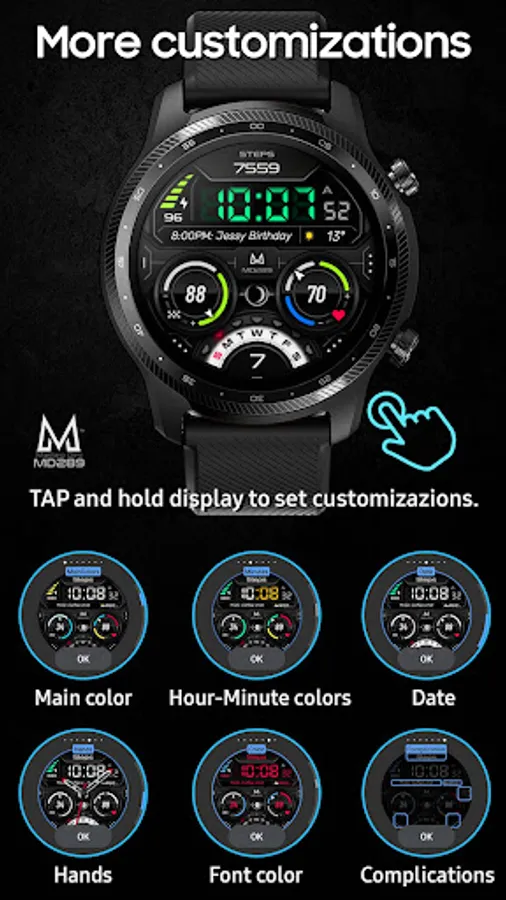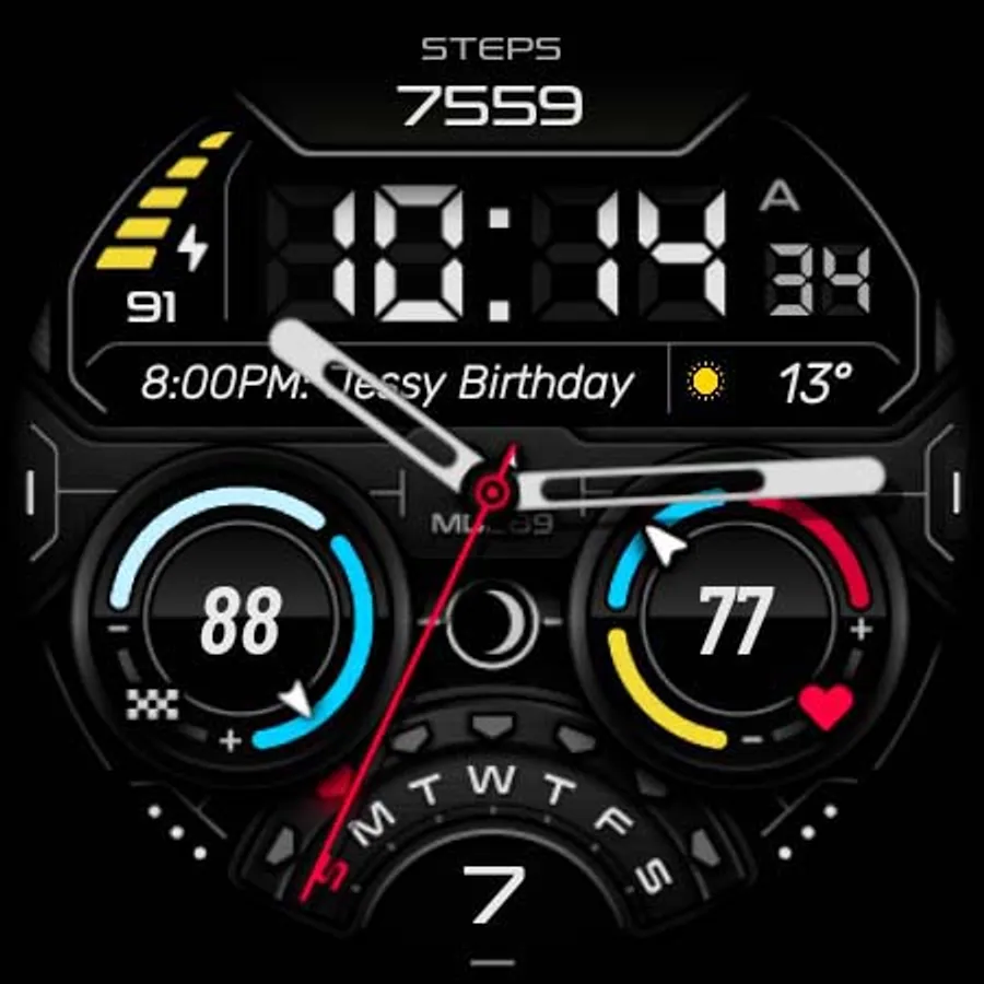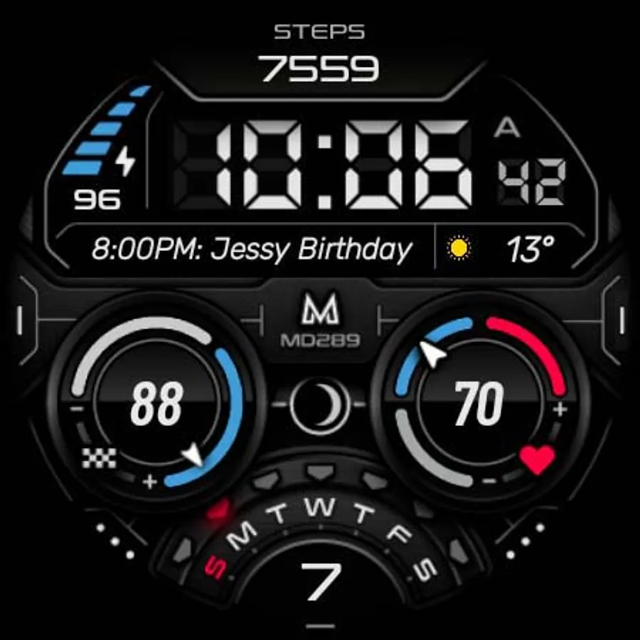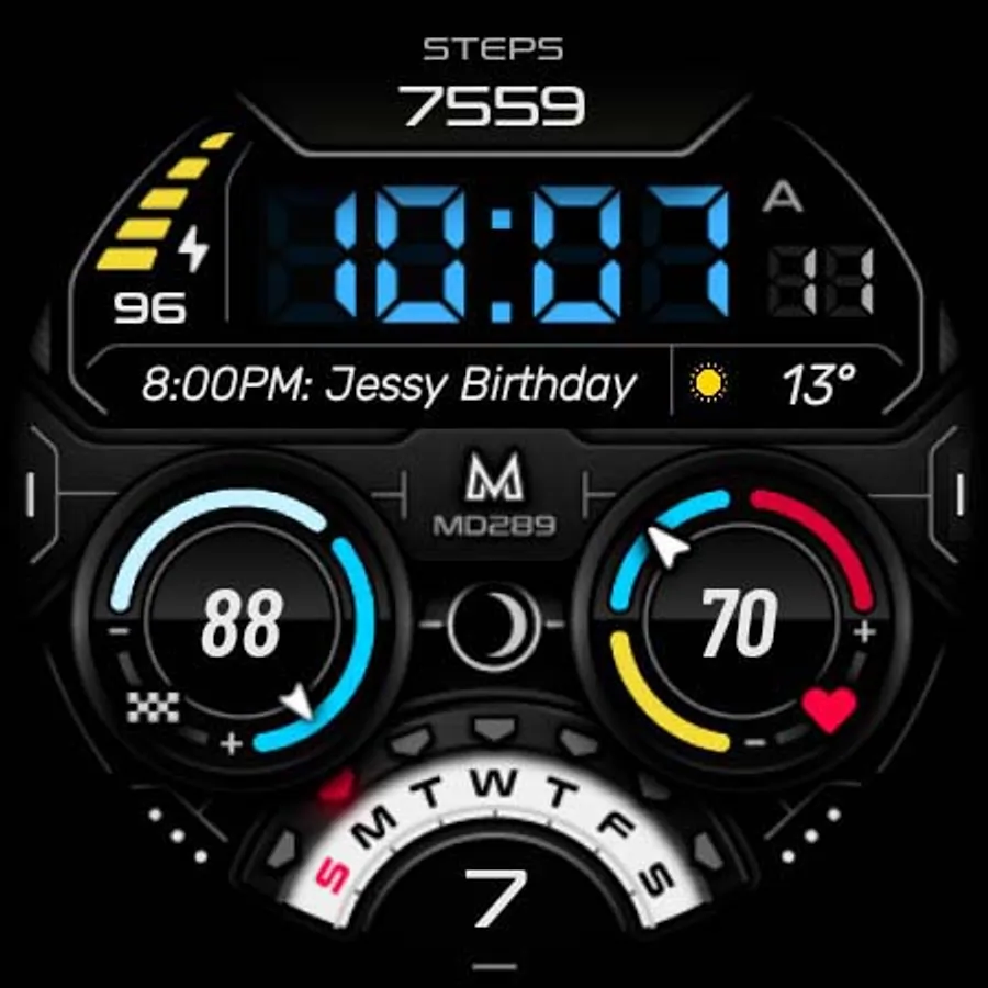It contains 3 Preset App shortcuts, 2 customizable shortcuts, steps, heart rate, moon phase, date, 3 customizable complications where you can have the data you prefer such as "barometer", "weather" (etc.), changeable colors and more.