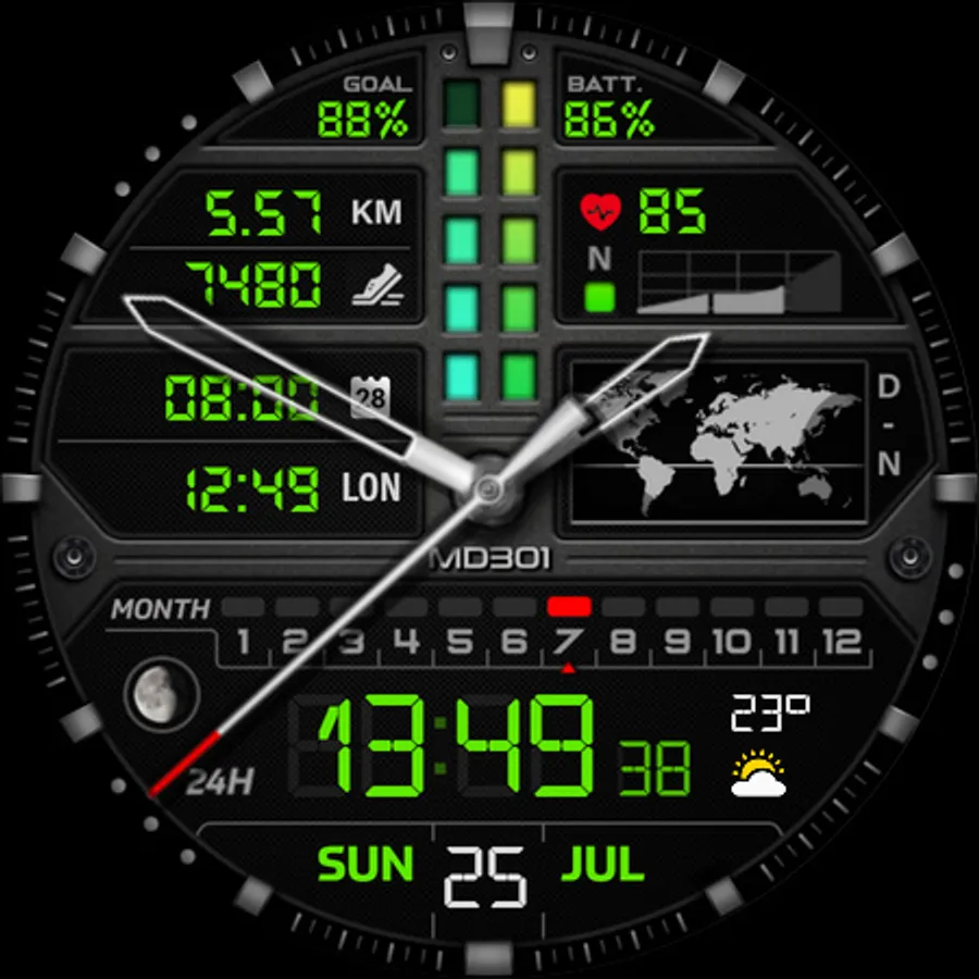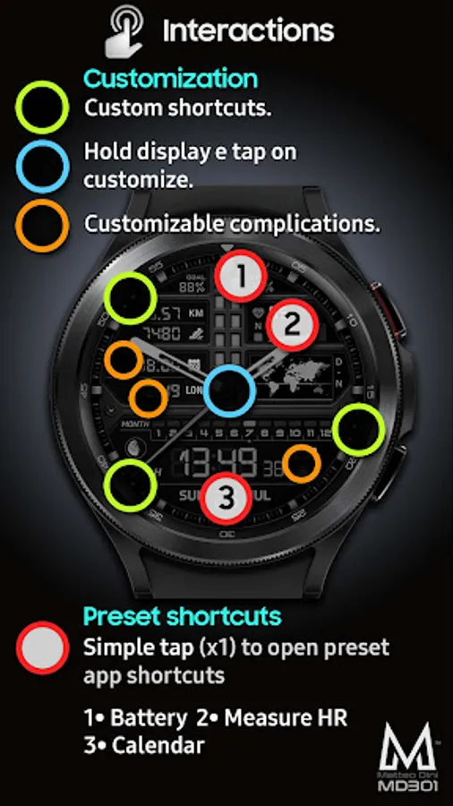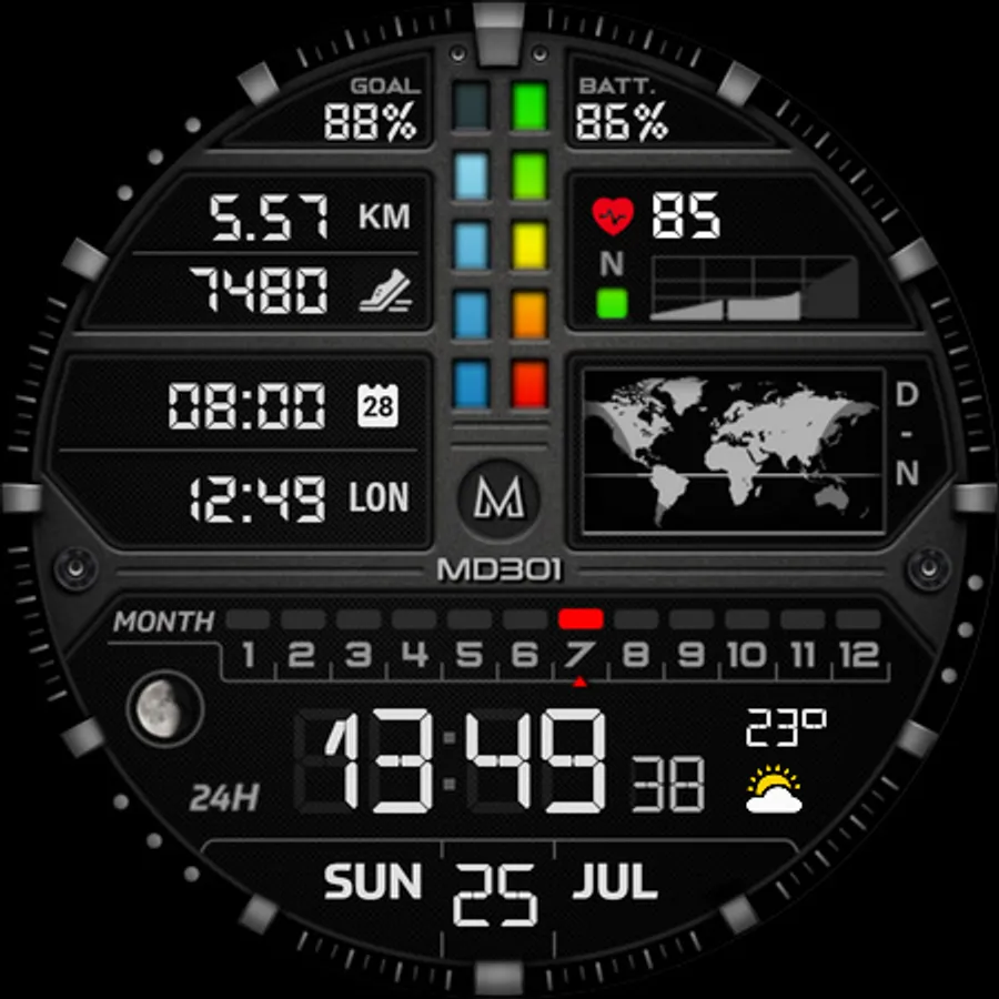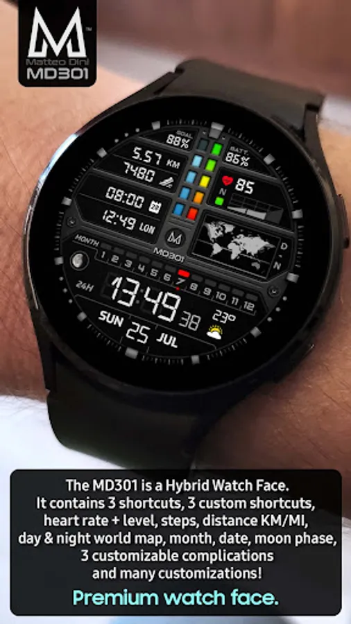 It contains 3 Preset App shortcuts, 3 customizable shortcuts, day & night world map, steps, distance KM/MI*, heart rate** + intervals, date, month, moon phase, 3 customizable complications where you can have the data you prefer such as weather (etc), changeable colors and more.