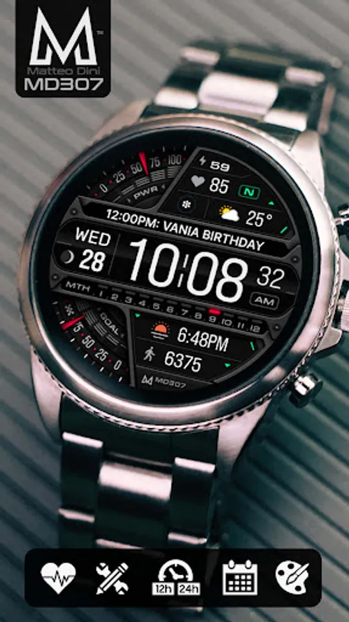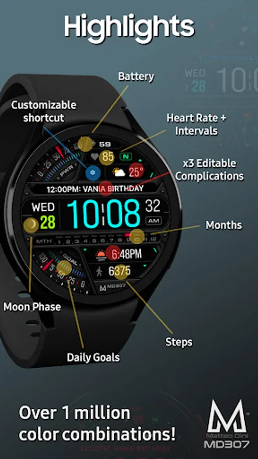 It contains 3 Preset App shortcuts, 1 customizable shortcut, moon phase, steps, daily goals, heart rate + intervals*, 3 customizable complications where you can have the data you prefer such as weather (etc), changeable colors and more.