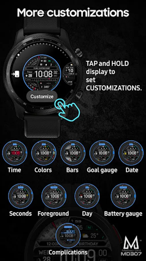 - Changeable colors of time, date, day, seconds, foreground, bars, goal and battery gauges and general colors.