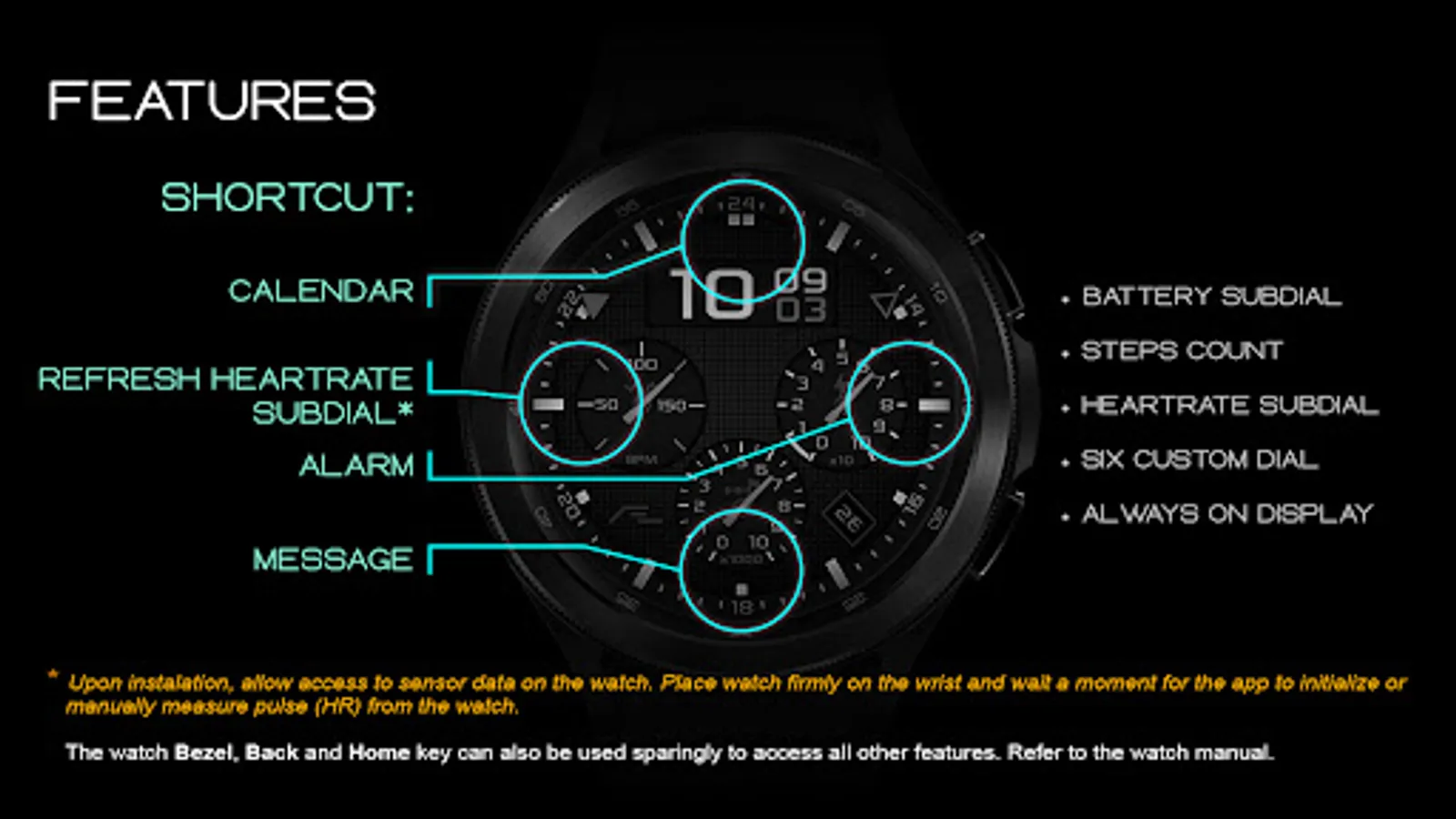 During installation, allow access to sensor data on the watch. Paired with phone app, place watch firmly on the wrist and wait a moment for the app to initialize the Heartrate or double tap the shortcut and give it a moment for the watch to measure. Kindly refer to ‘Features’ screenshot to identify shortcut locations.