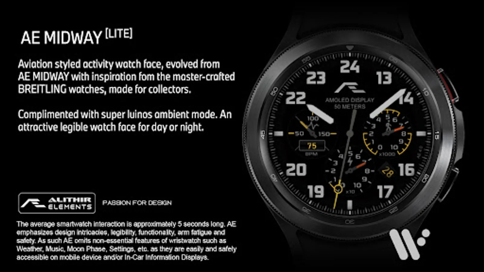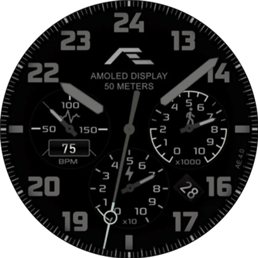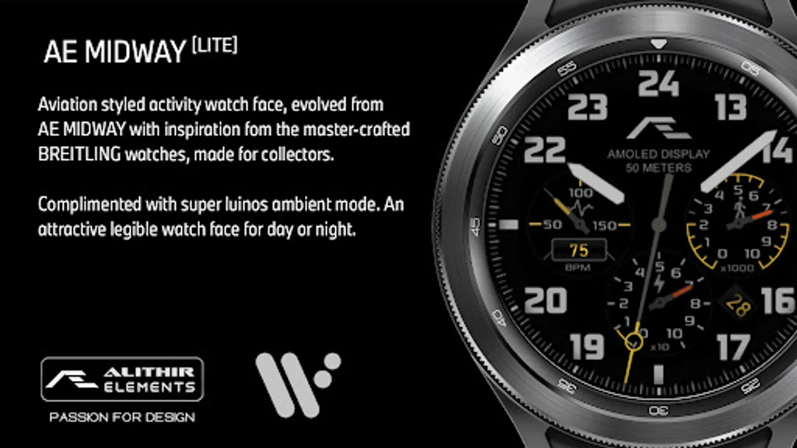 Aviation-styled activity watch face evolved from the popular AE MIDWAY series watch faces with inspiration from the master-crafted BREITLING watches, made for collectors.