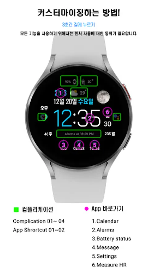 1. Press and hold the watch face > 2. Click the Decorate button > 3. Tap each complication area to set the corresponding information > 4. Click OK