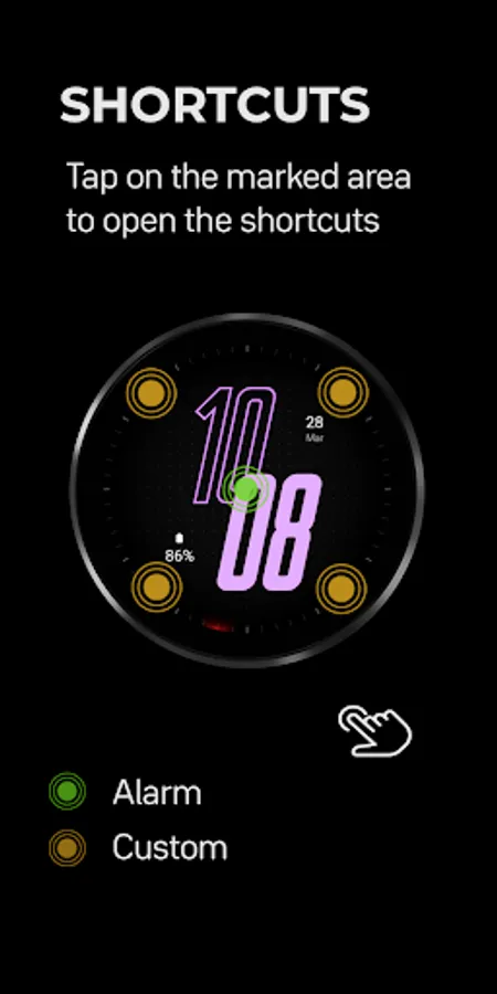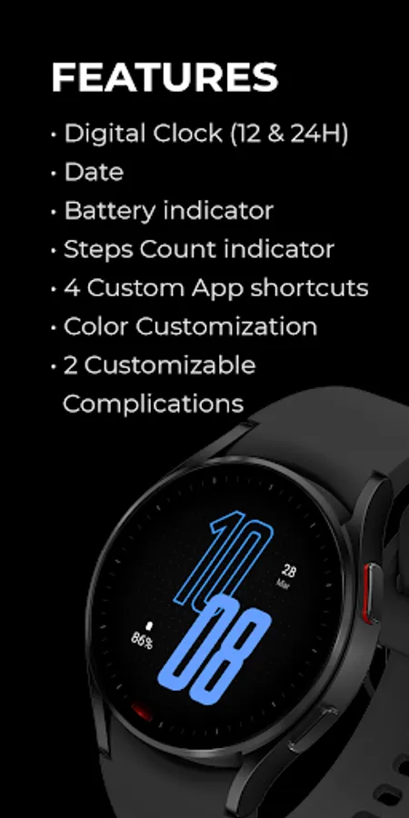This Wear OS watch face is customizable with colors, complications, and 4 app shortcuts for easy access. The minimalistic design ensures a sleek and modern look while remaining easy to use.