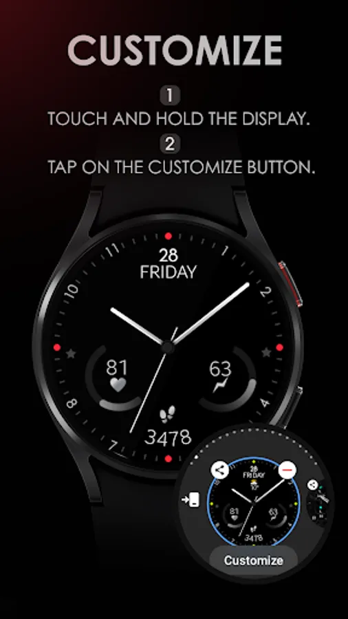 - To customize your watch face, simply touch and hold the display, then tap on the Customize button.