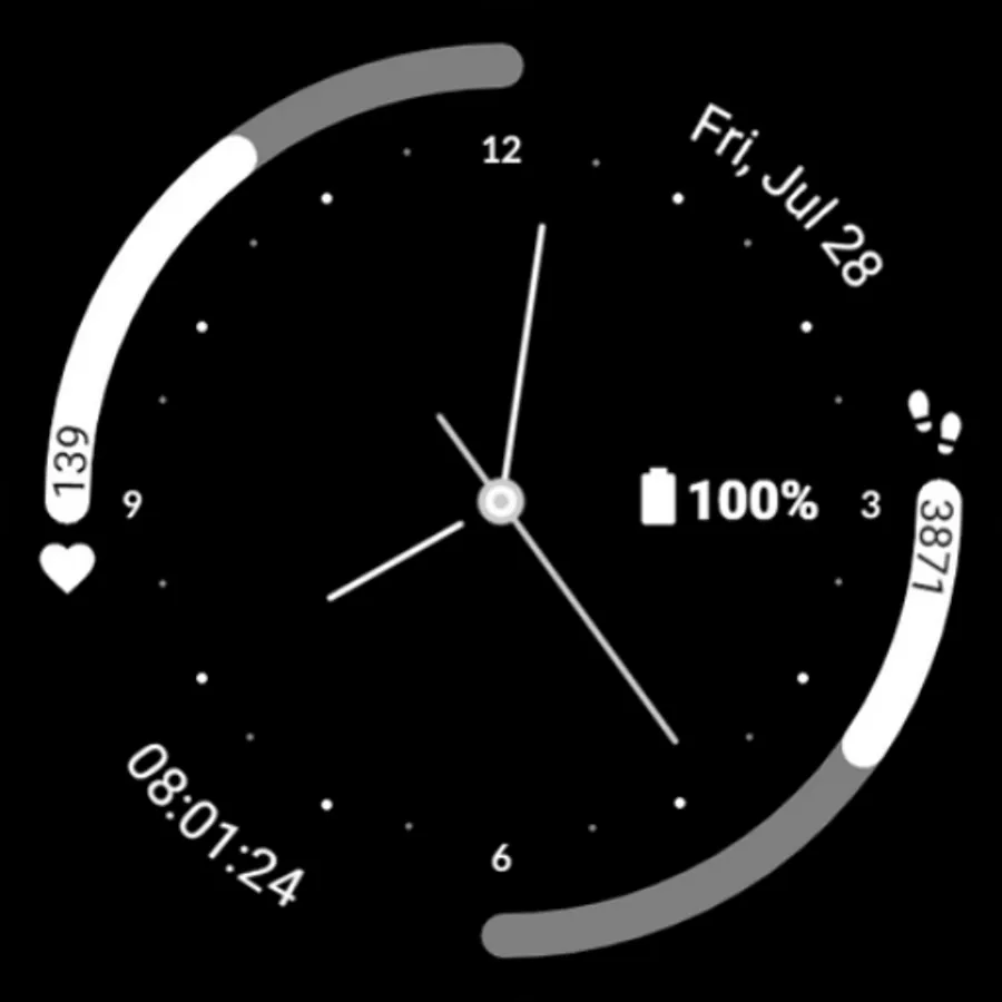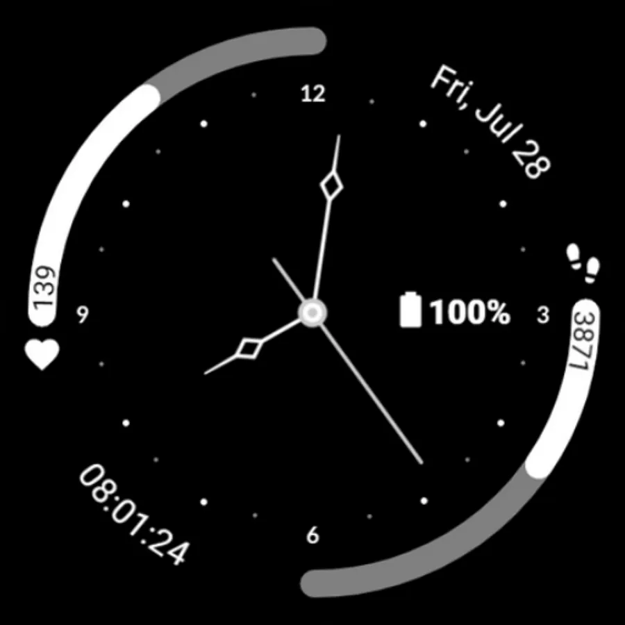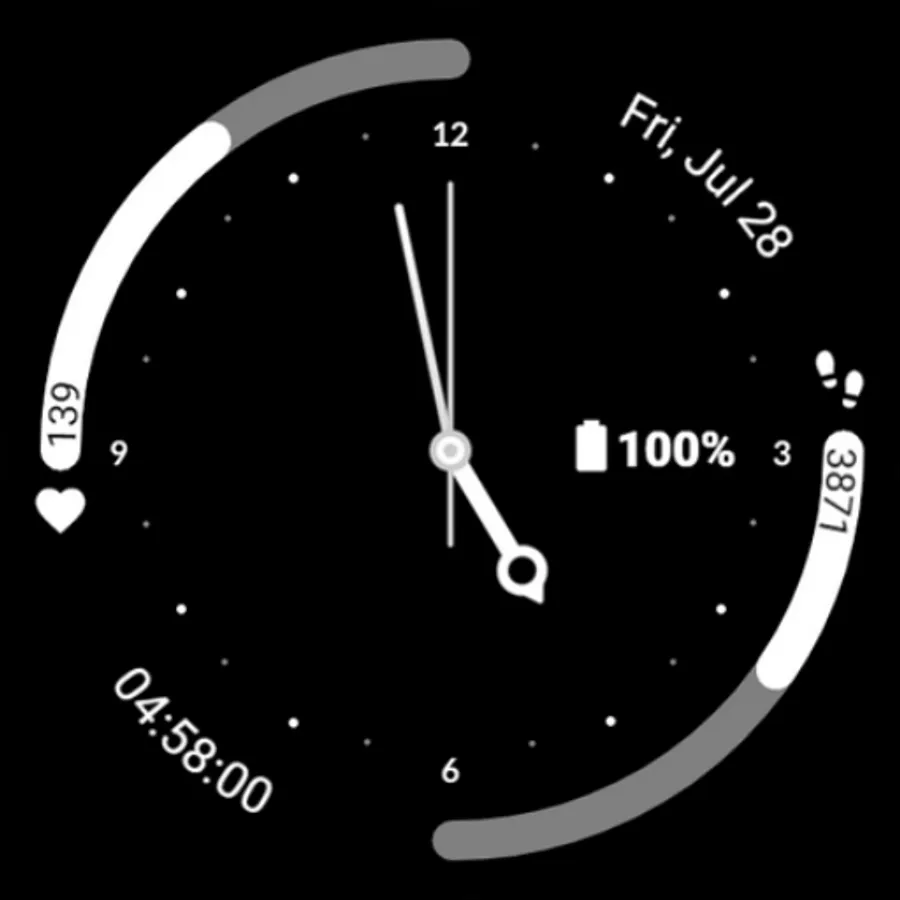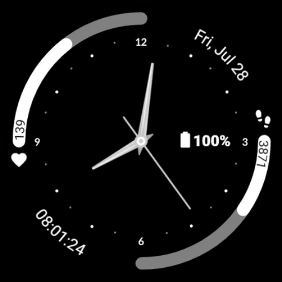 Imagine a watch that stands out for its striking simplicity, while offering vital information at your fingertips. With a completely dark design, this minimalist watch face provides a clean and sharp screen, allowing you to focus on what really matters: your health and wellness data.