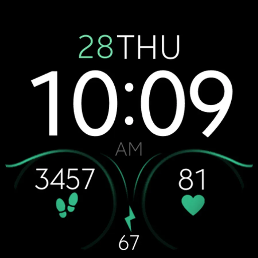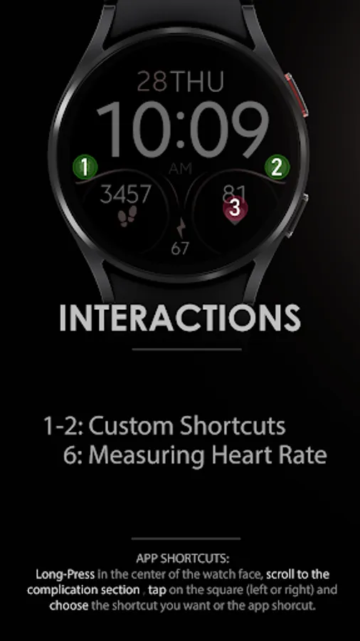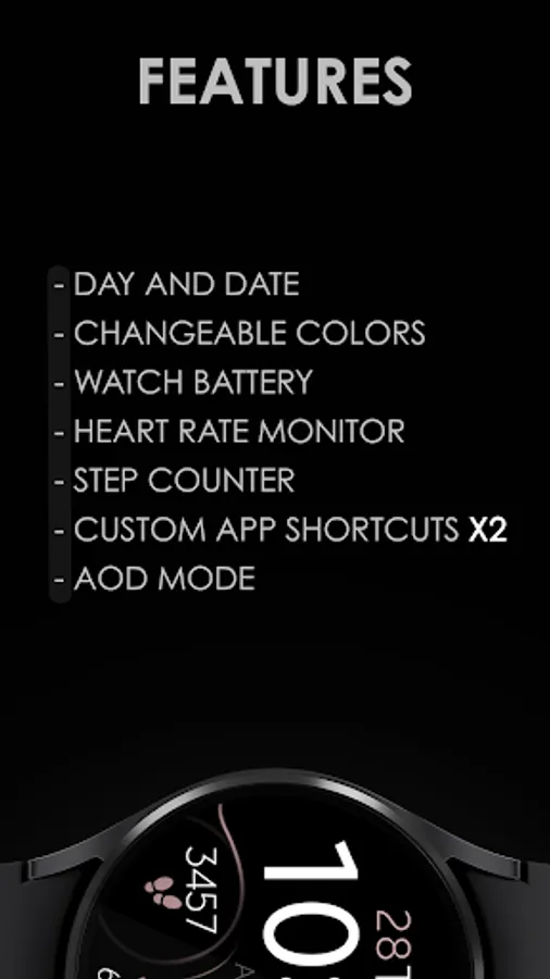 This elegant timepiece boasts a sleek design with subtle rose gold accents, all set against a crisp black background. With just two app custom shortcuts and fixed complications like Watch Battery, Step Counter, and Heart Rate, this watch face is perfect for those who want a clean and uncluttered look. Plus, you can easily change the color scheme to match your personal style. Download now and experience the beauty of simplicity!