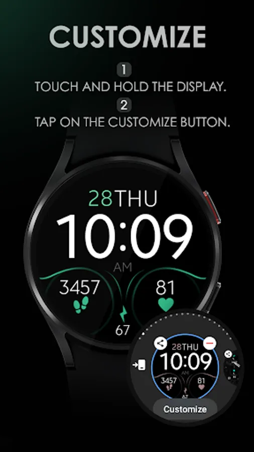 - To customize your watch face, simply touch and hold the display, then tap on the Customize button.
