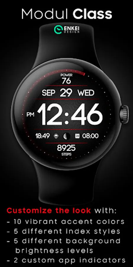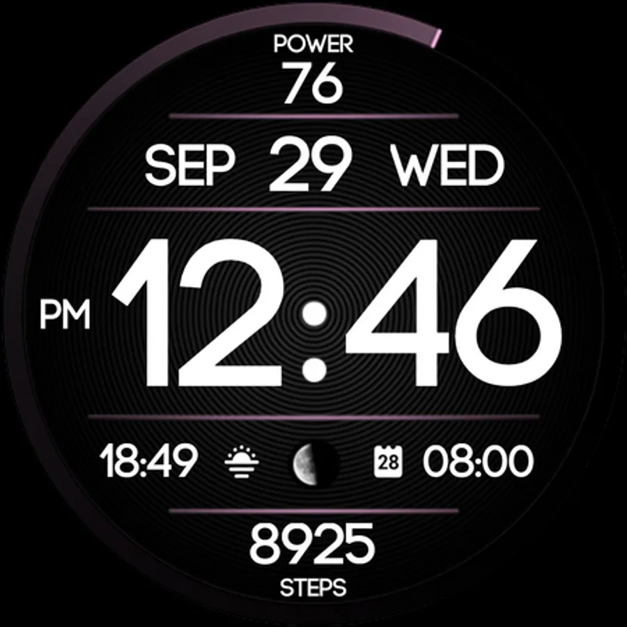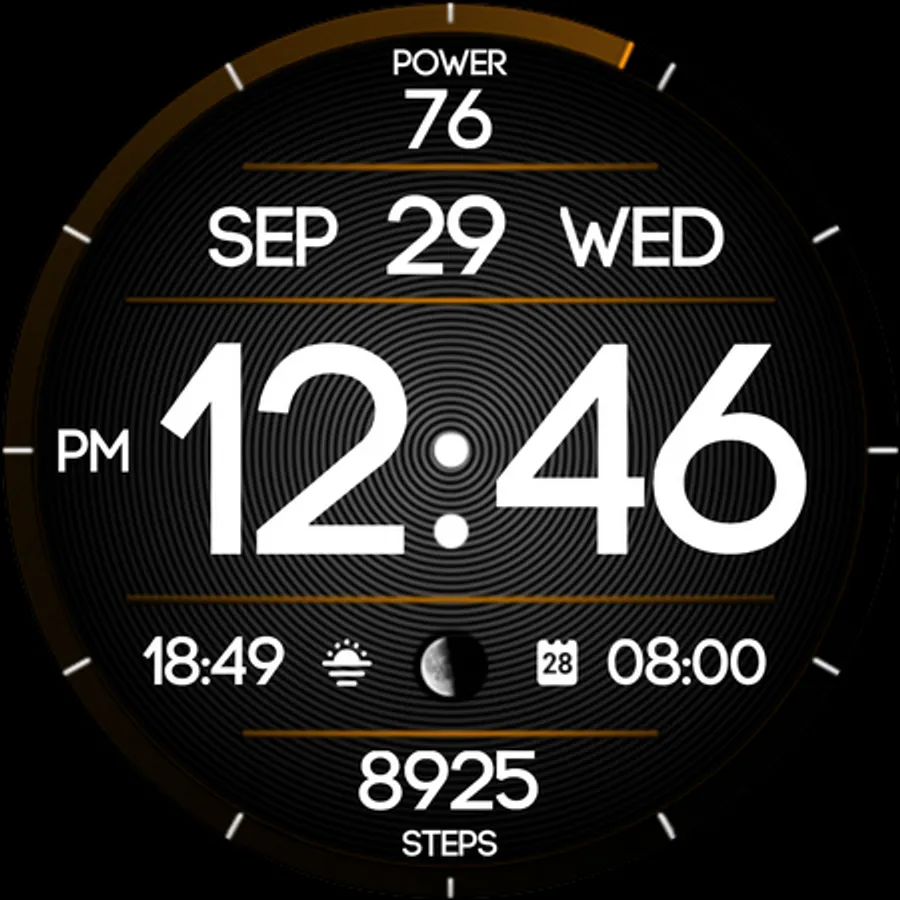 Informative layout displays all the info you’ll need, from your general health stats and current Moon phase, to date, battery and time - with 2 customizable indicators!