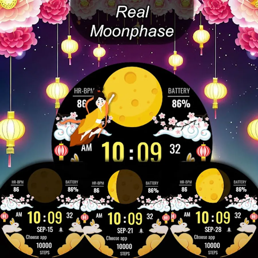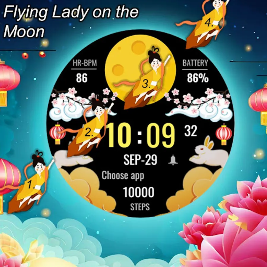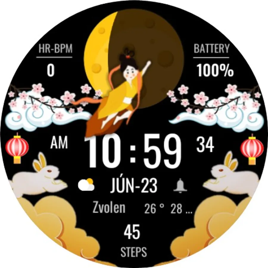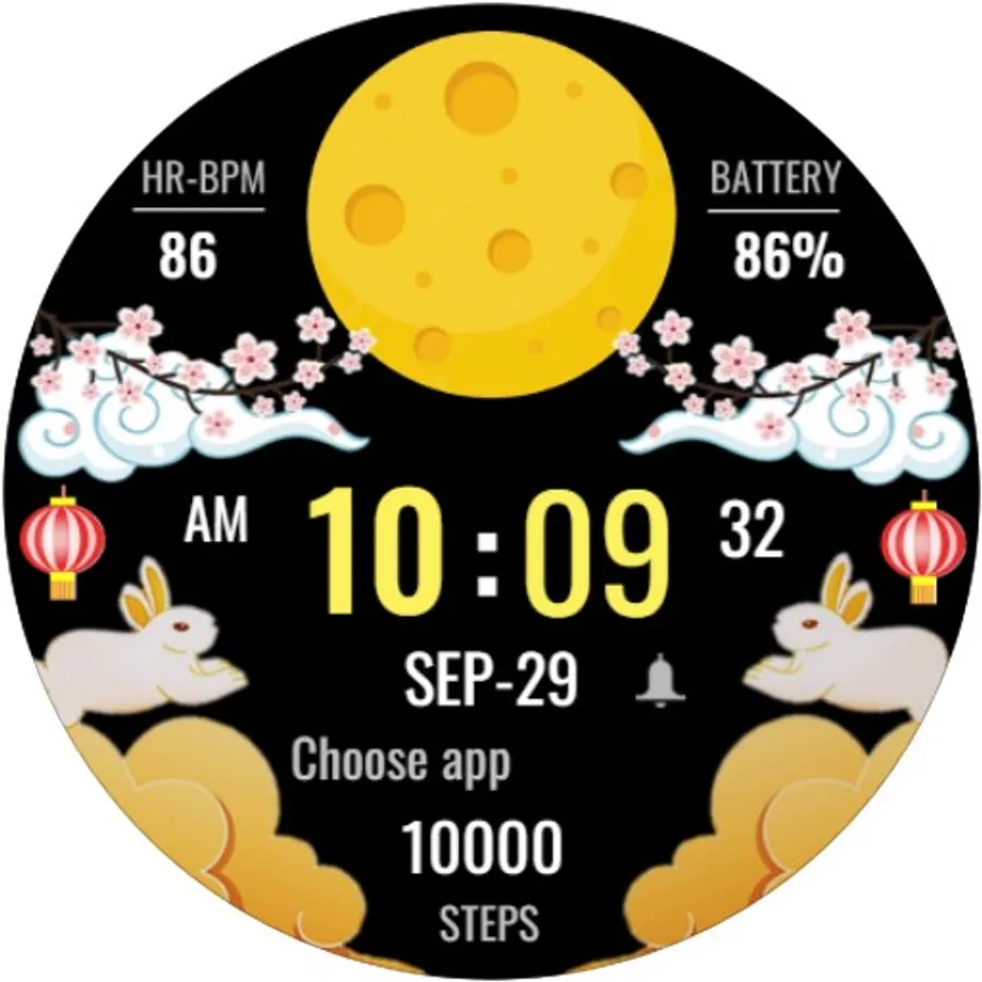 ⌚︎ On this beautiful illustrative Moon festival watch-face you will see the moon rabbit as one of the symbols of this festival. Beautiful Moon – this is real moon phase; all users can track moon-phase and flying beautiful Lady on the moon. That symbol brings atmosphere of this Mid-autumn festival. Watch face contains Digital time 12-24h time format, Date information, Battery percentage Steps and Heart rate. Moon phase and 1 custom application