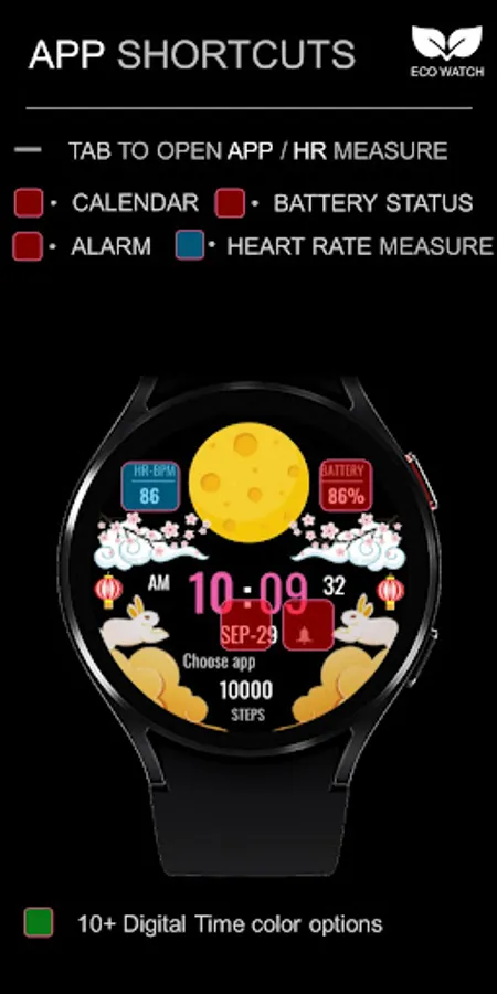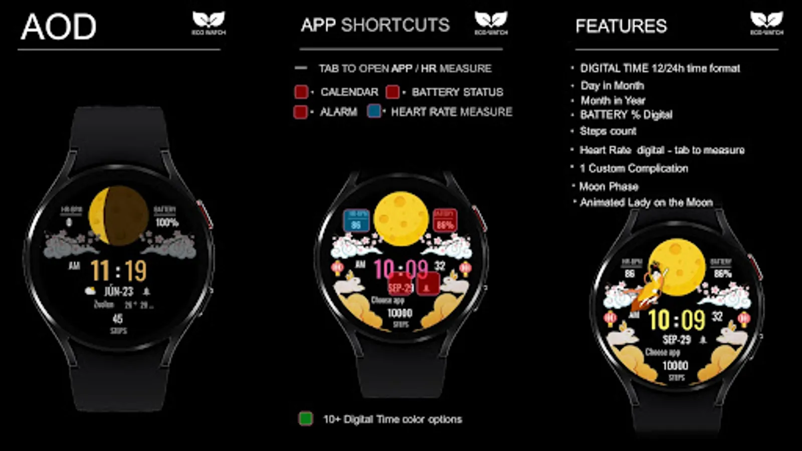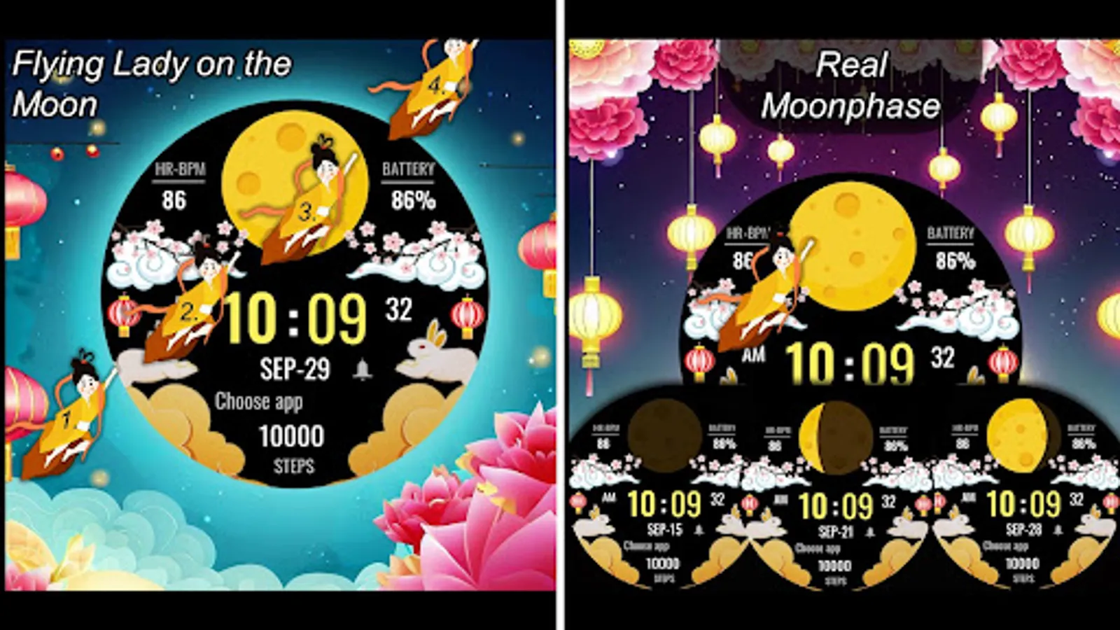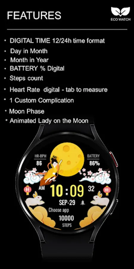⌚︎ On this beautiful illustrative Moon festival watch-face you will see the moon rabbit as one of the symbols of this festival. Beautiful Moon – this is real moon phase; all users can track moon-phase and flying beautiful Lady on the moon. That symbol brings atmosphere of this Mid-autumn festival. Watch face contains Digital time 12-24h time format, Date information, Battery percentage Steps and Heart rate. Moon phase and 1 custom application