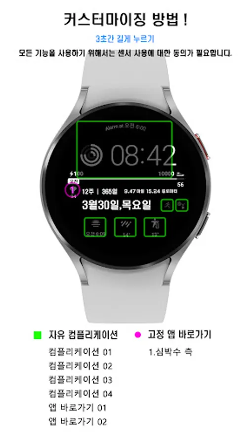 1. Press and hold the watch face > 2. Click the Decorate button > 3. Tap each complication area to set the corresponding information > 4. Click OK