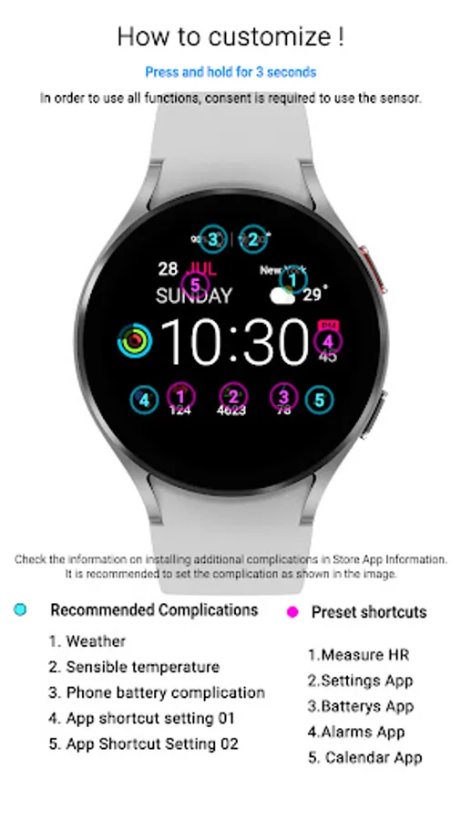 1. Press and hold the watch face > 2. Click the Decorate button > 3. Tap each complication area to set the corresponding information > 4. Click OK