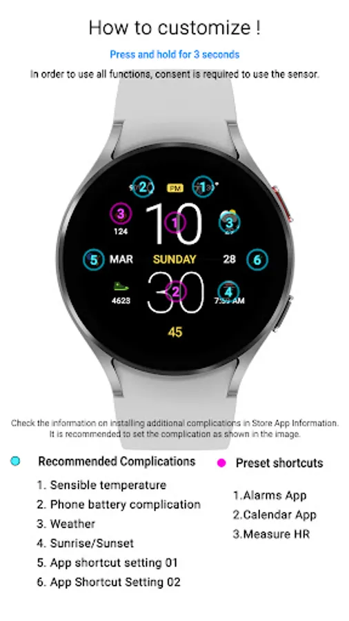1. Press and hold the watch face > 2. Click the Decorate button > 3. Tap each complication area to set the corresponding information