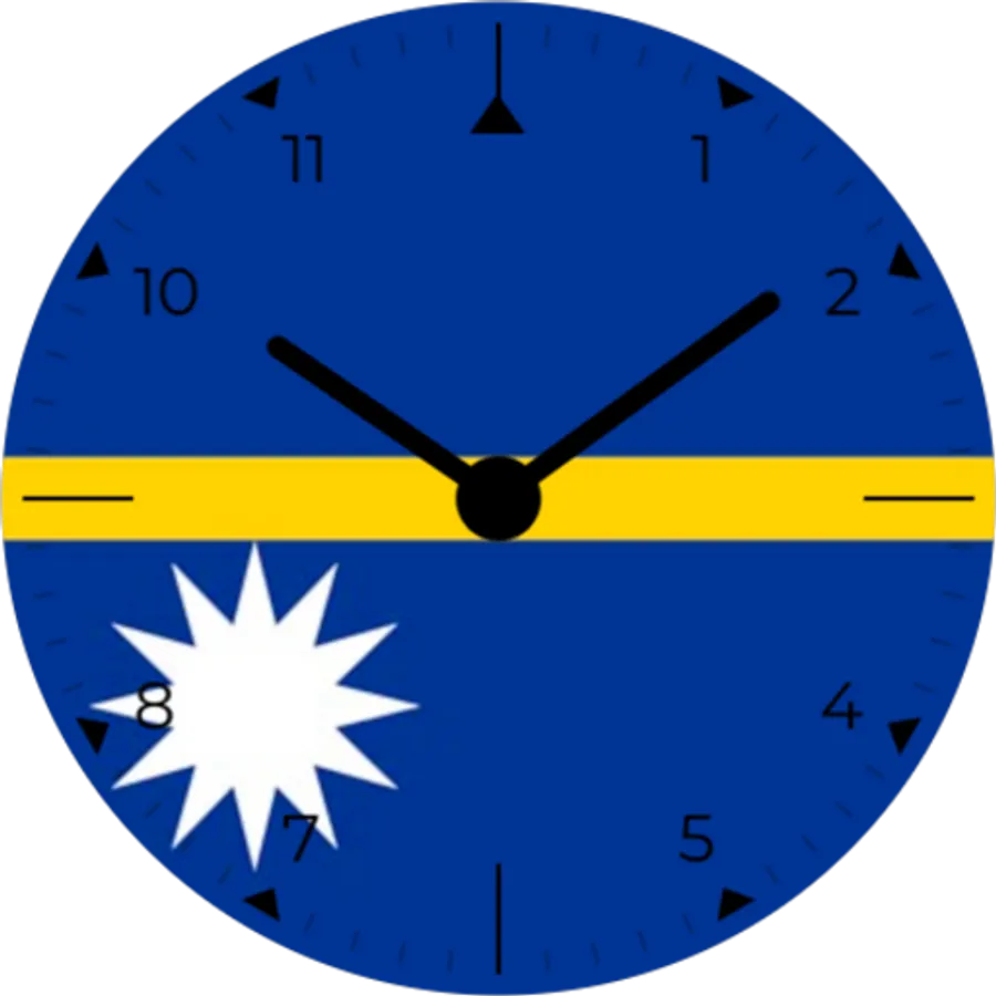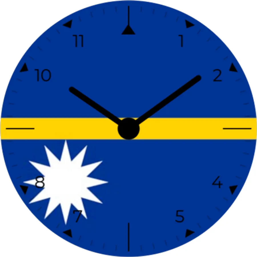 Analog watch face with Nauru flag in background. Show the pride in your nation with a sleek, modern watch face with your countries national flag. Always on display simple white on black for longer battery life.