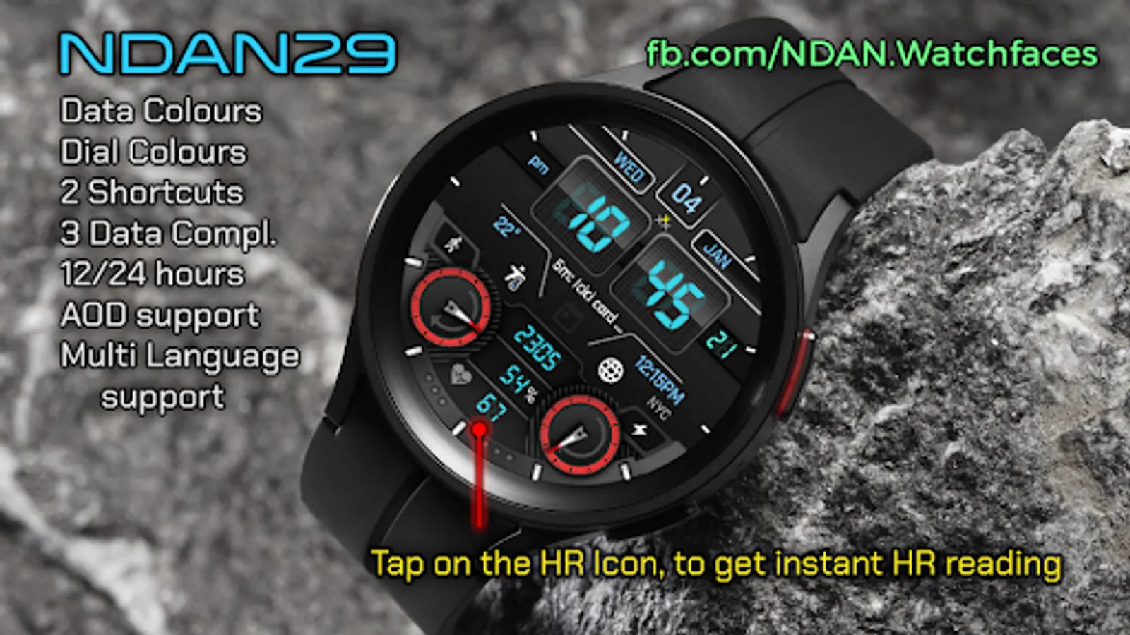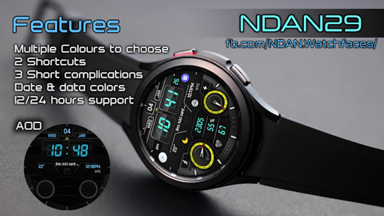 NDAN29 is a watch face for Wear OS with many customizations.