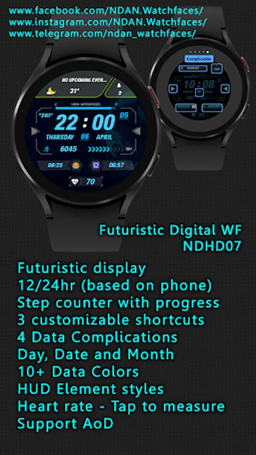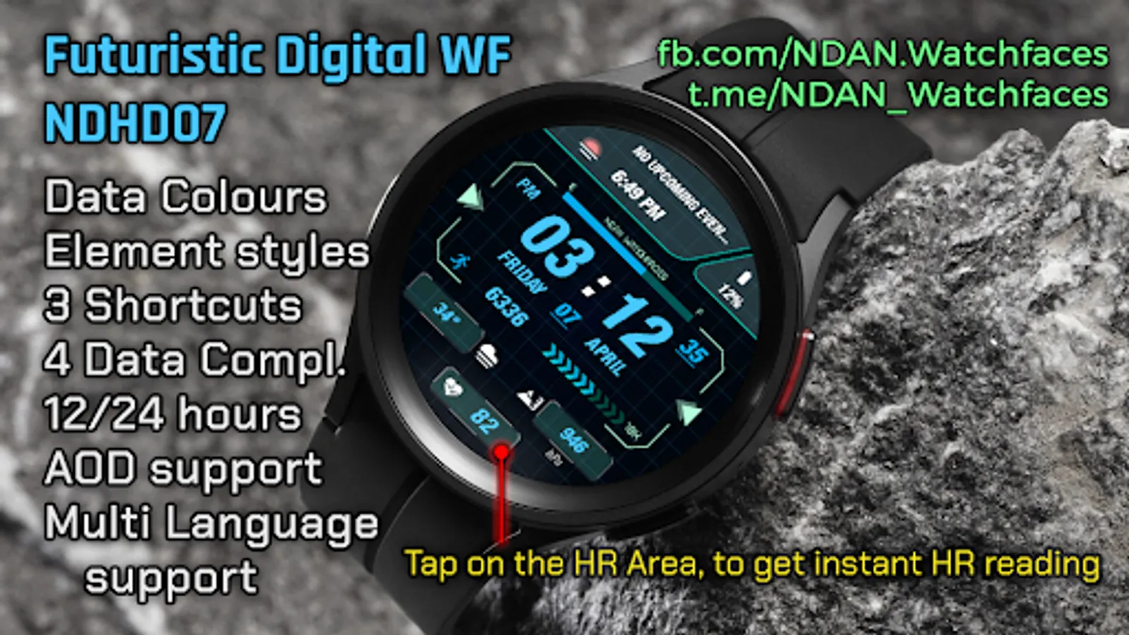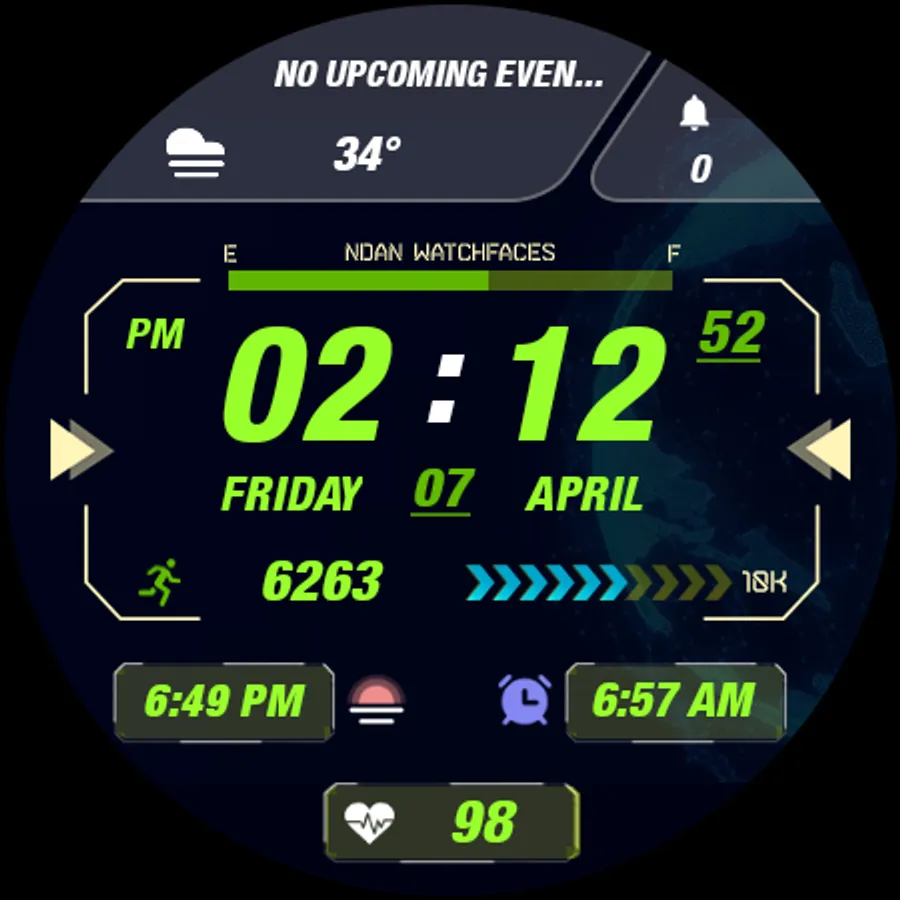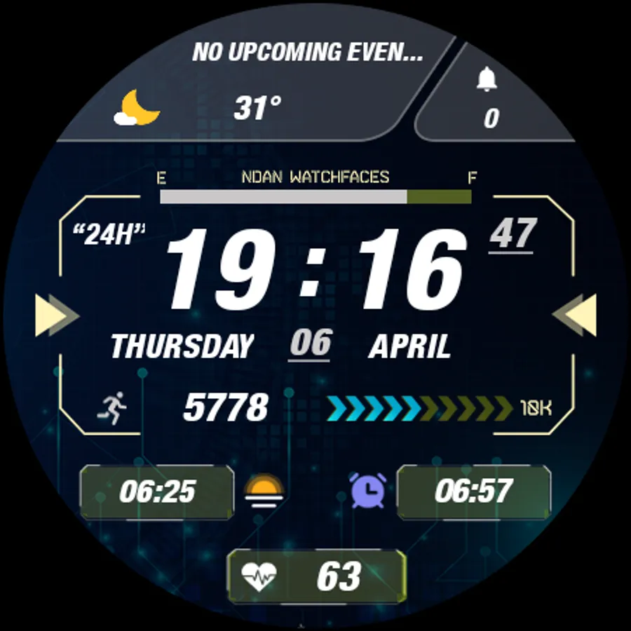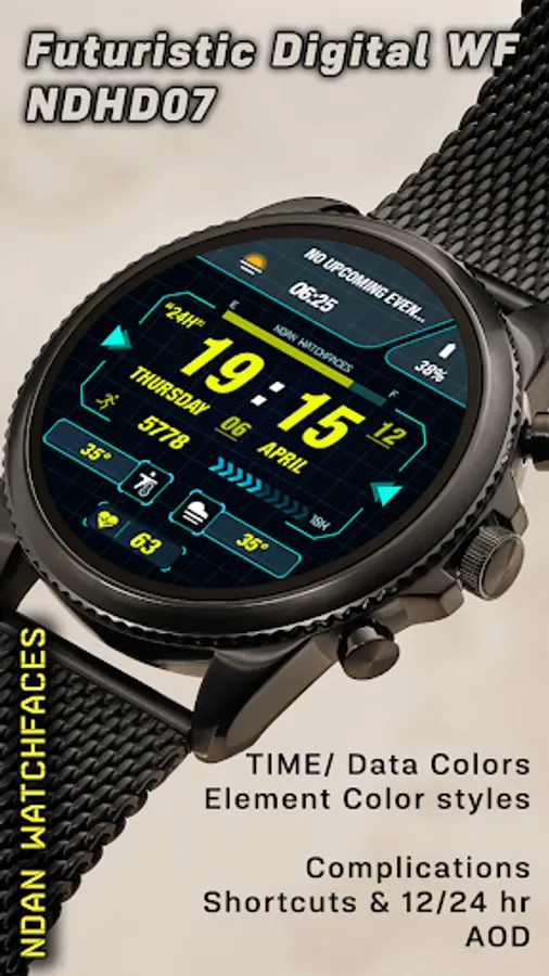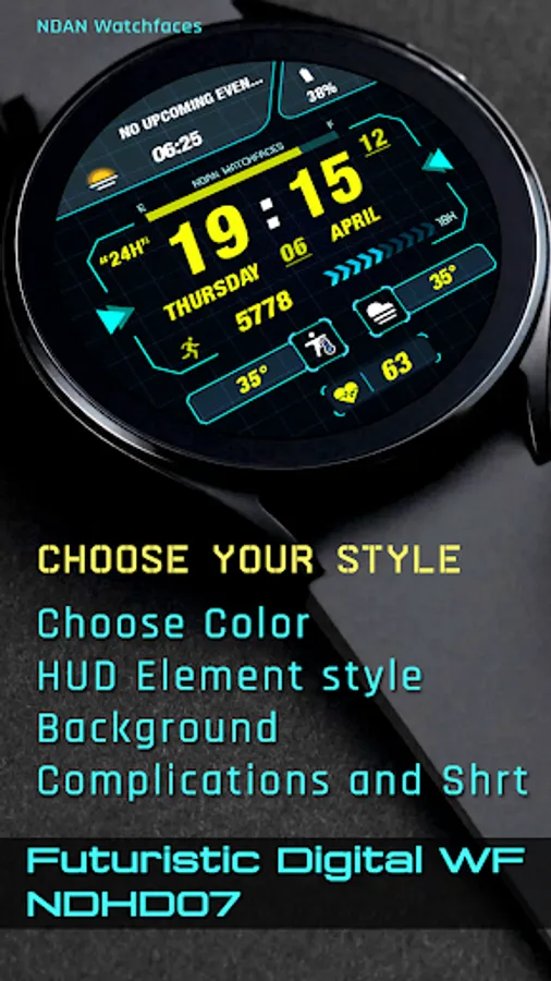 The watch face offers many options for both data (colors) and styles (HUD). You can mix and match colors to make it look as per your choice.
