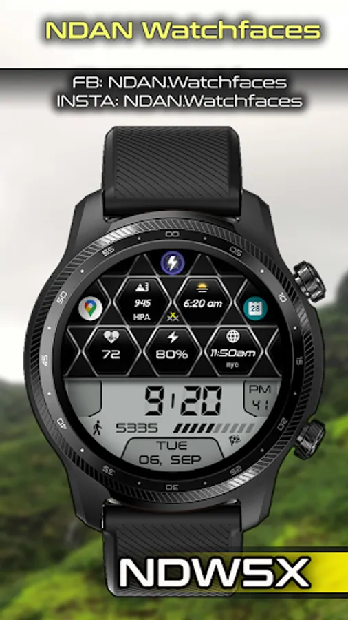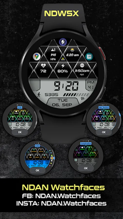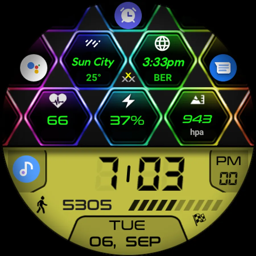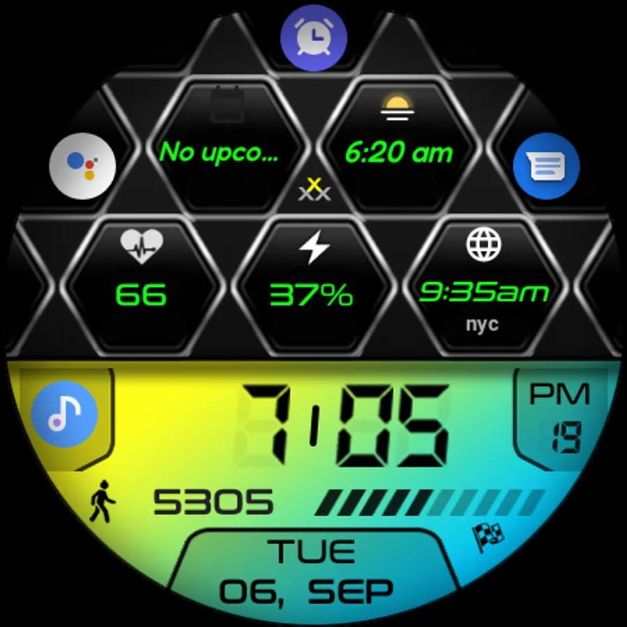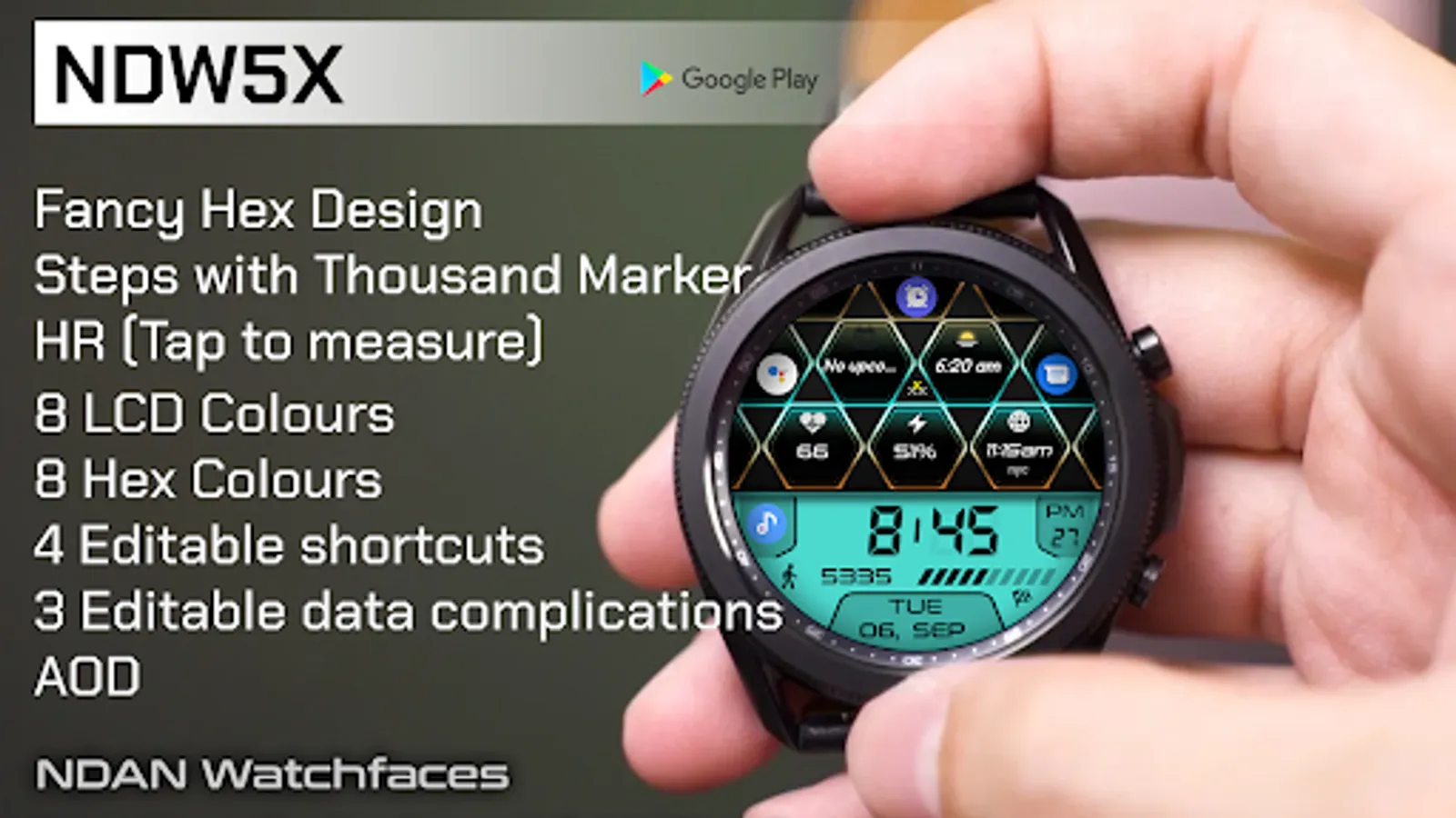NDW5X is a fancy watch face for Wear OS with many customizations with hexagonal design at top and LCD look at bottom.