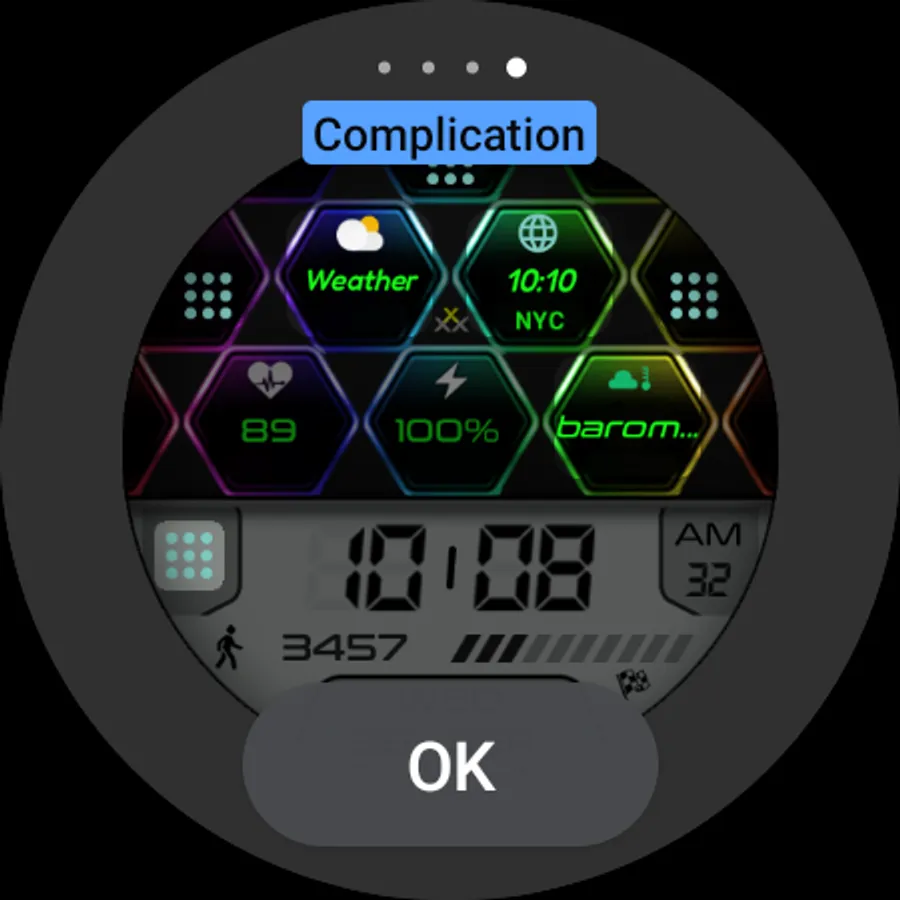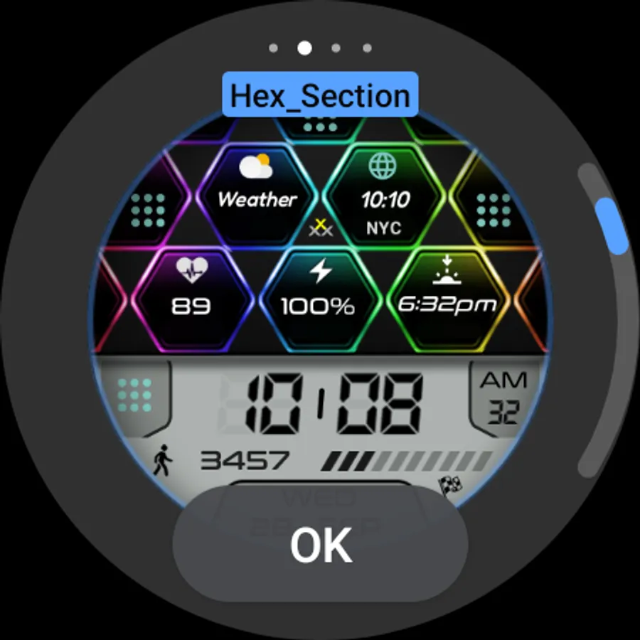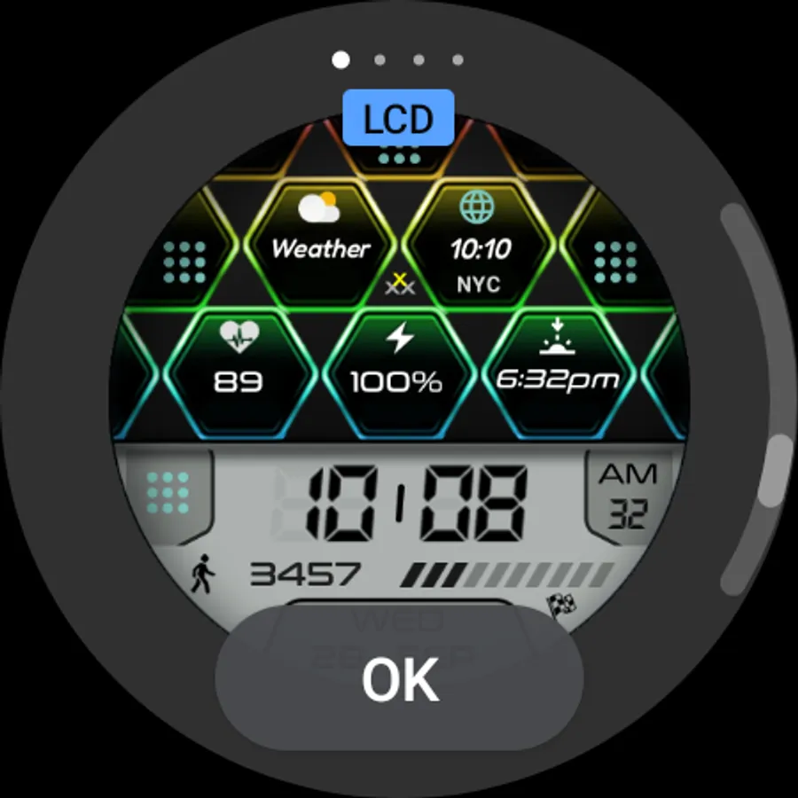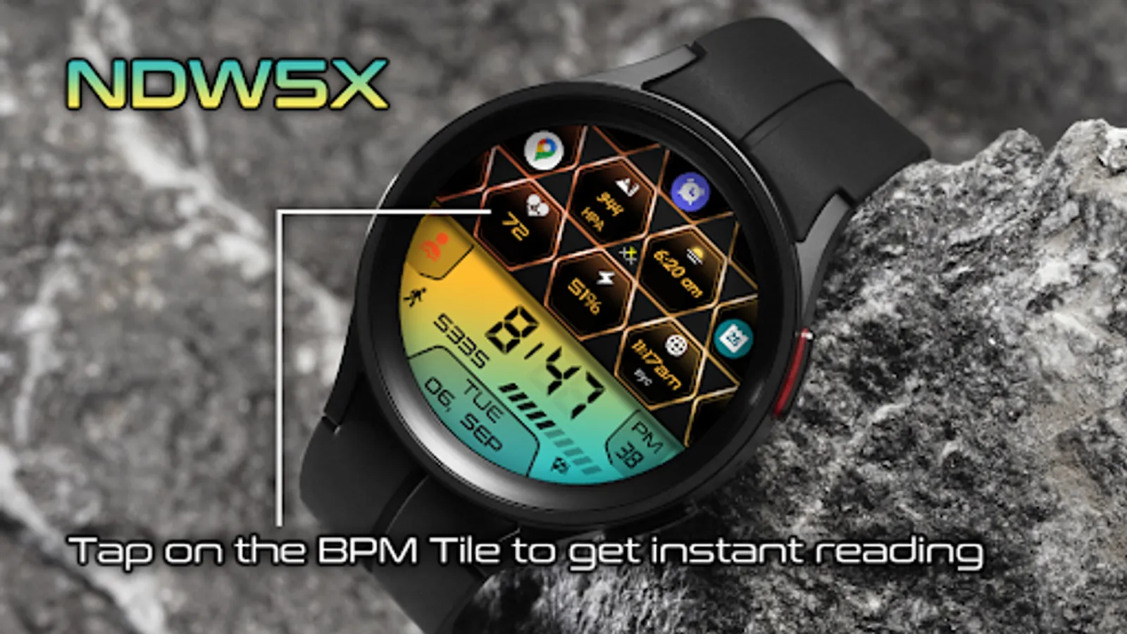 NDW5X is a fancy watch face for Wear OS with many customizations with hexagonal design at top and LCD look at bottom.