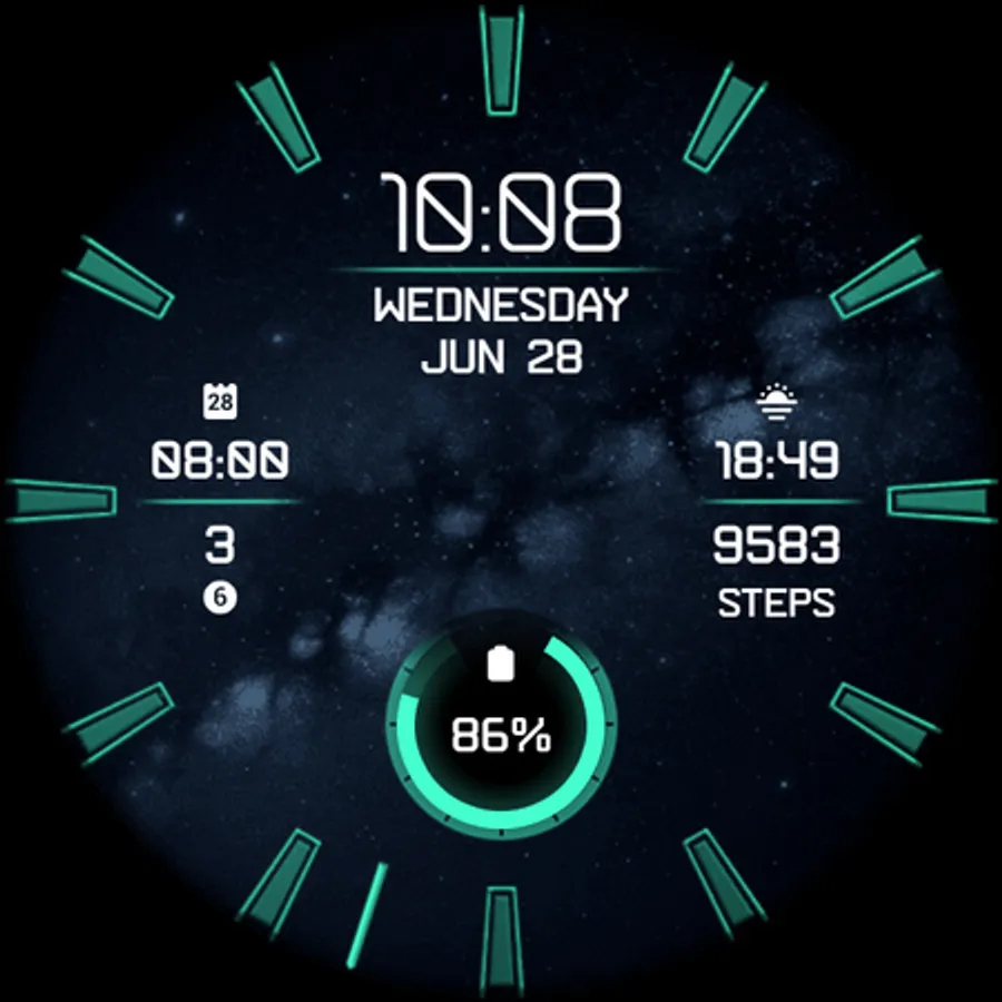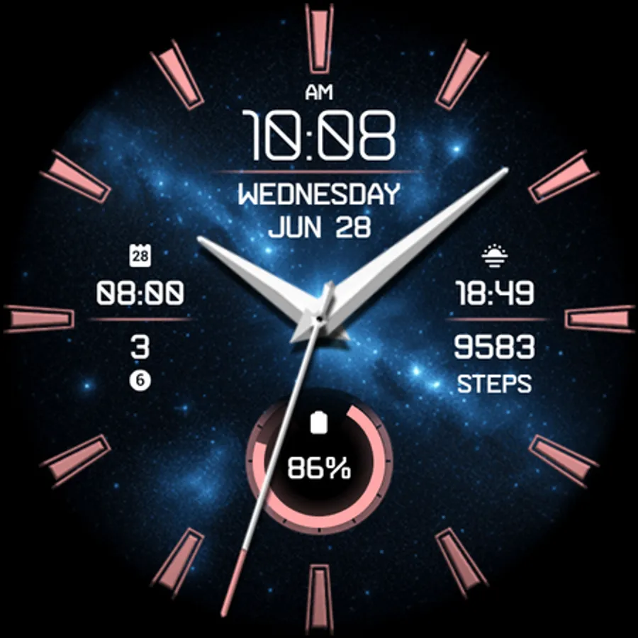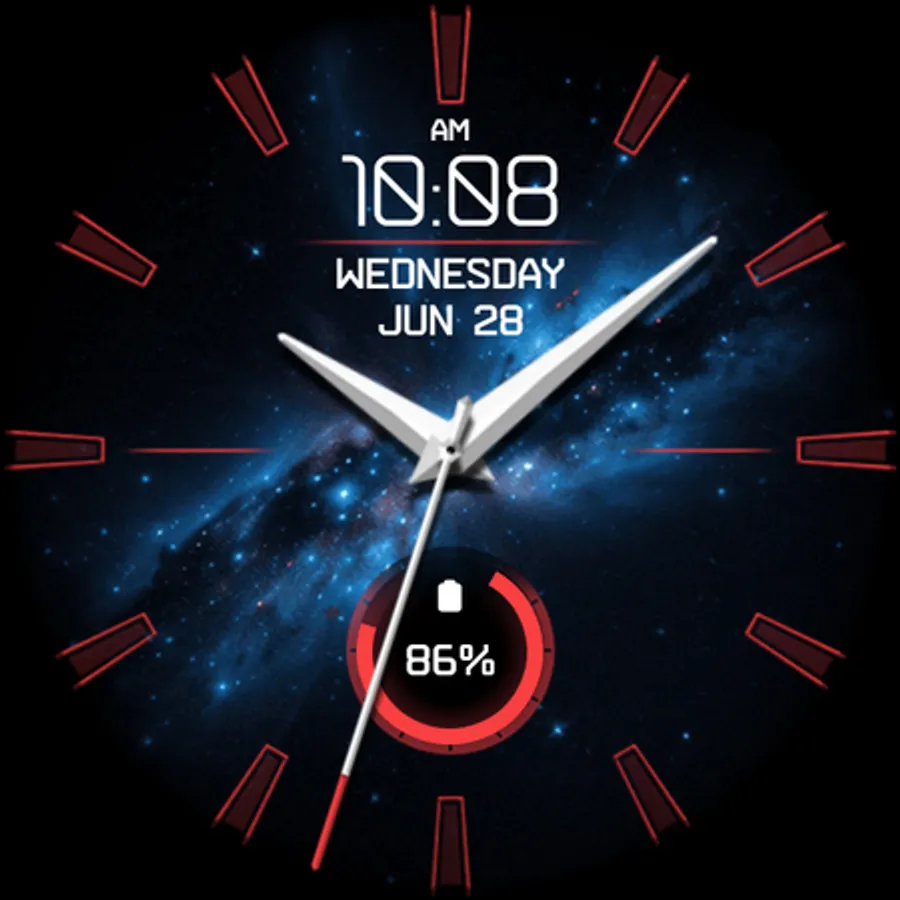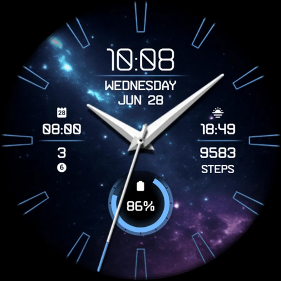Customizable space background, colors, hands and indicators - Tons of possibilities to combine and create your perfect layout!