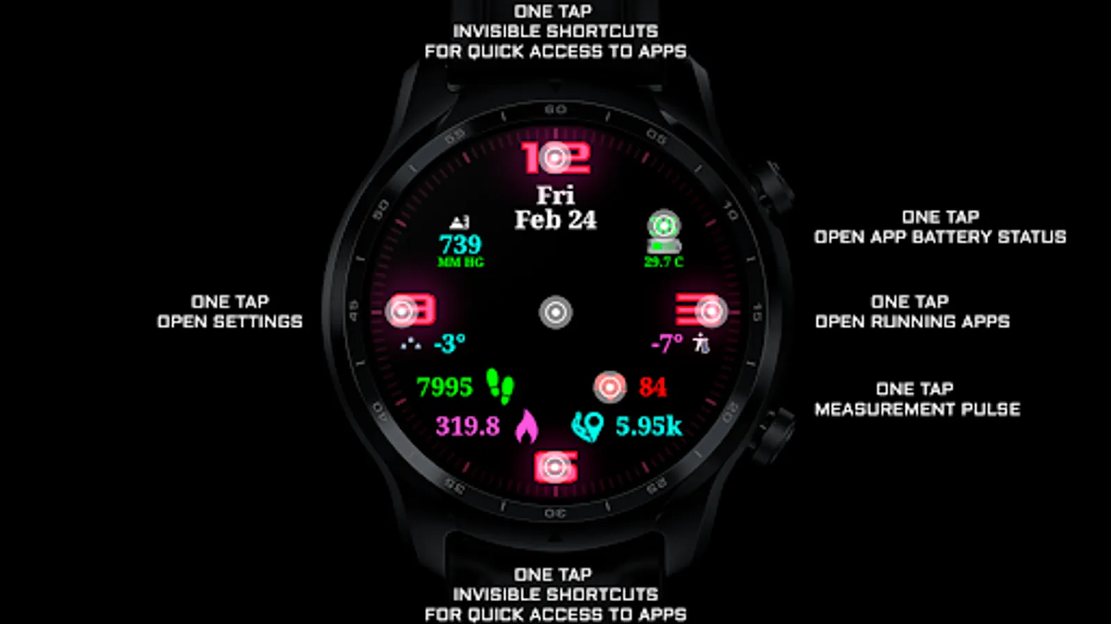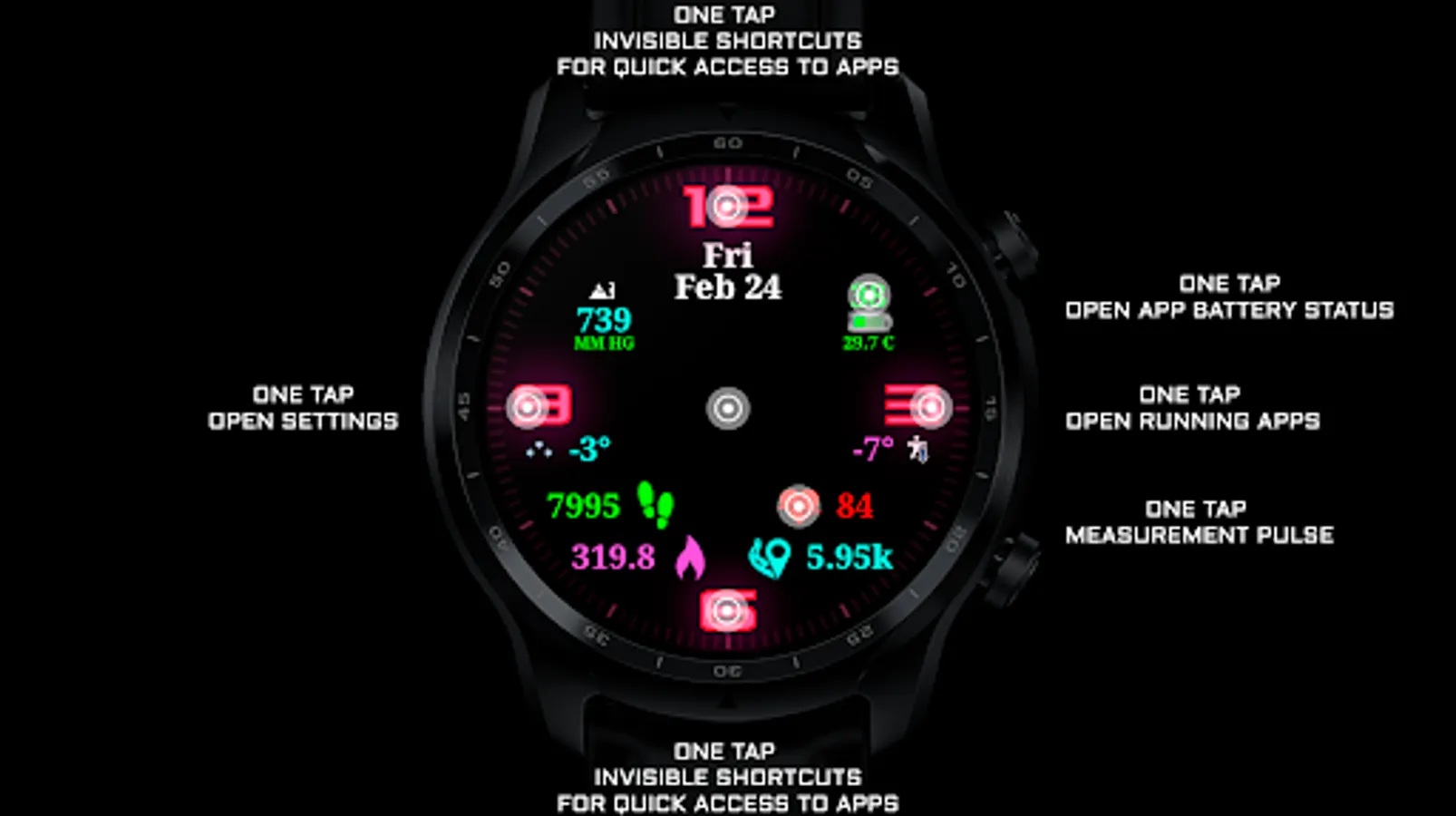 In the watch face available sports data, complications(data) and invisible shortcuts for quick access to apps.