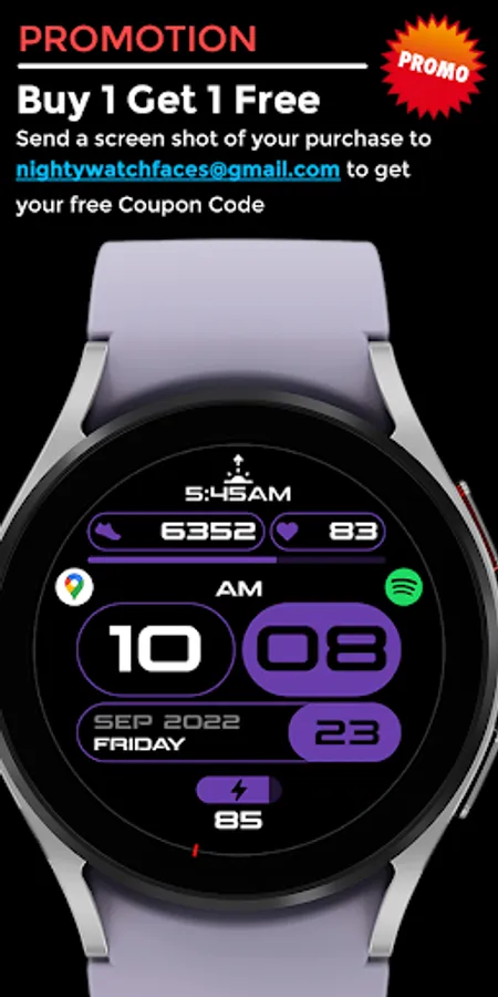 Send a screenshot of your purchase to nightywatchfaces@gmail.com to get your free promo code