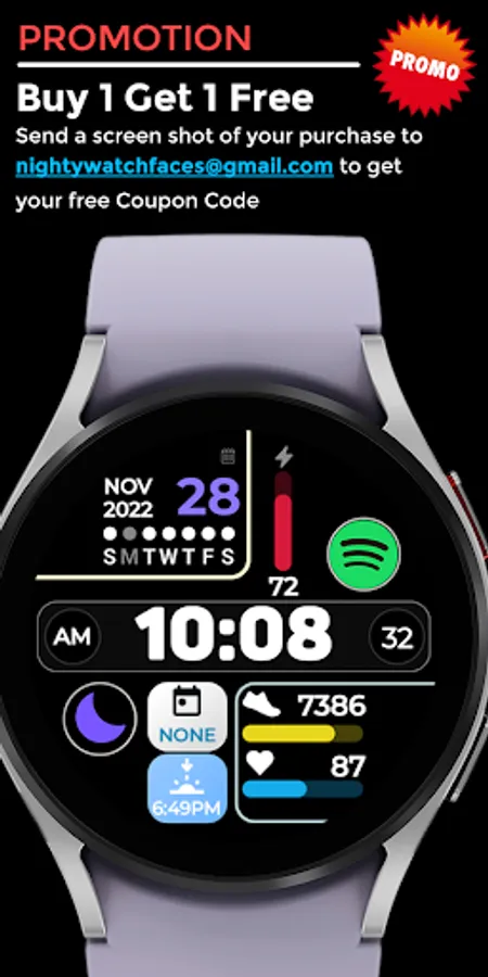 Send a screenshot of your purchase to nightywatchfaces@gmail.com to get your free promo code