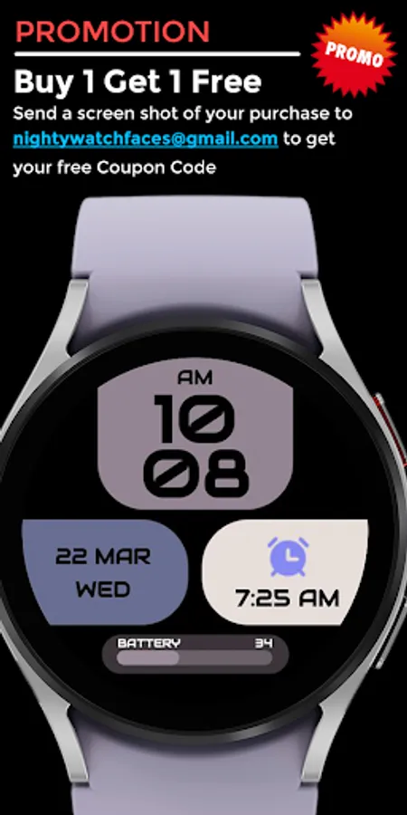 Send a screenshot of your purchase to nightywatchfaces@gmail.com to get your free promo code