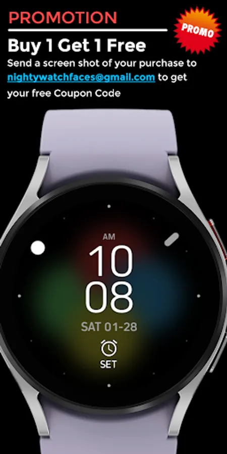 Send a screenshot of your purchase to nightywatchfaces@gmail.com to get your free promo code