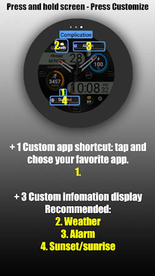 1 custom app shortcuts: set your favorite app, and then on watchface tap to open your app)