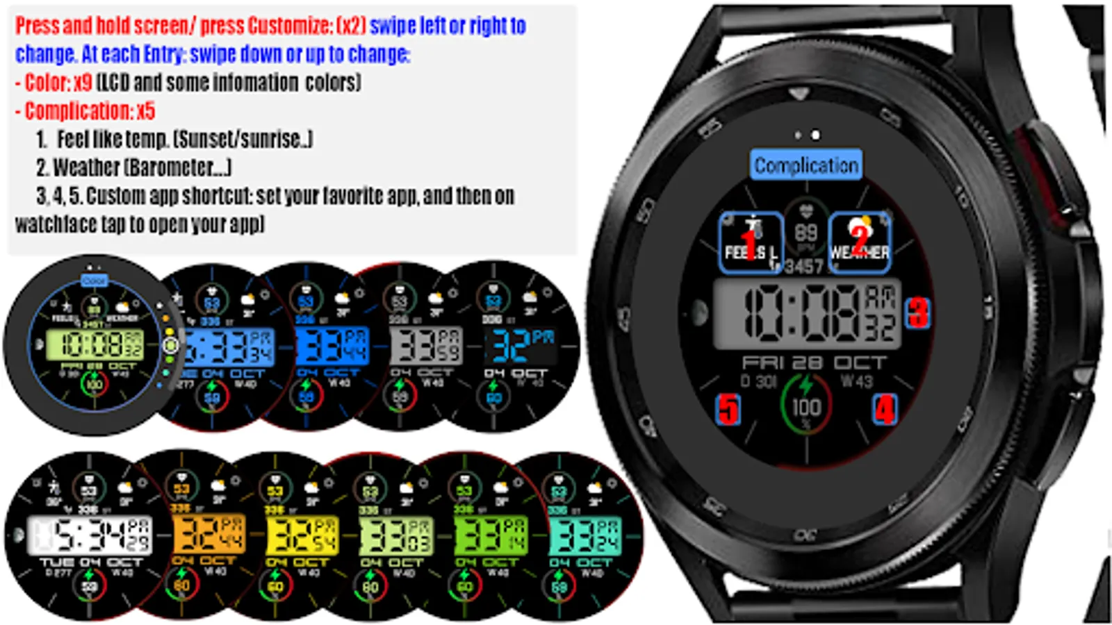 - 2 custom display information zones: Feel like temp., Weather (set it in Customize/Complication) (see screenshort)