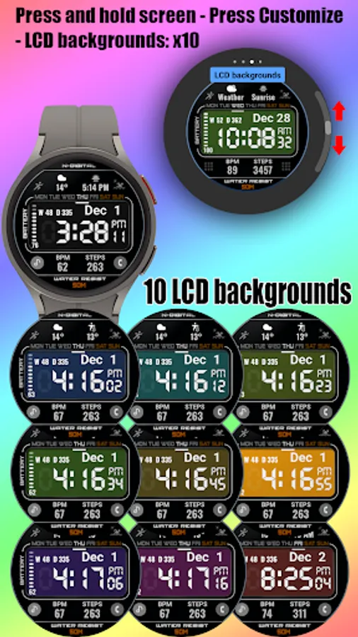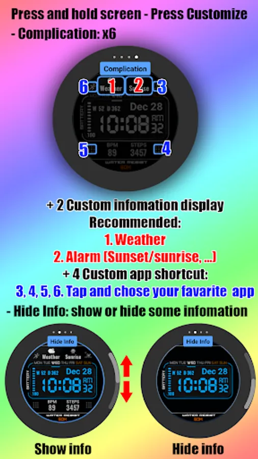 3, 4, 5, 6. Custom app shortcut: set your favorite app, and then on watchface tap to open your app)