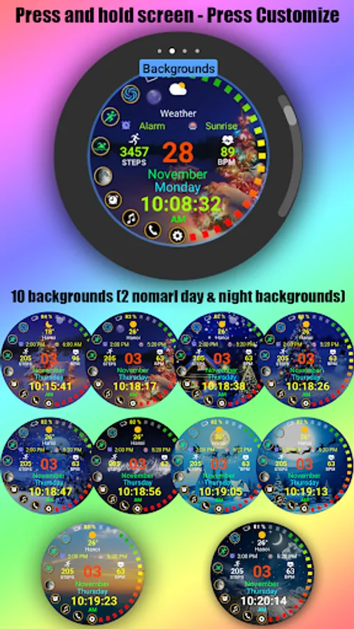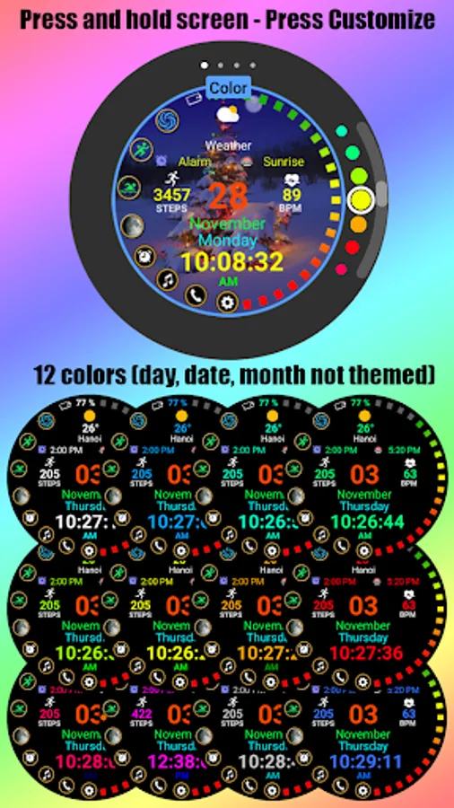 * For the heart rate work and show, please make sure: Connect watch with phone via bluetooth. "Allow watchface to access sensor data about your vital sign", ( if you didn't receive the popup message for the first apply watchface). Some time may need to switch other watch face and switch back this watch face to get that message. Please press and hold on the watch face, select Customize/Complicaition to ensure full permission for the watch face. Keep the watch on your wrist and tap heart rate area and wait a moment and for the heart rate monitor to work and display (this may take some time).