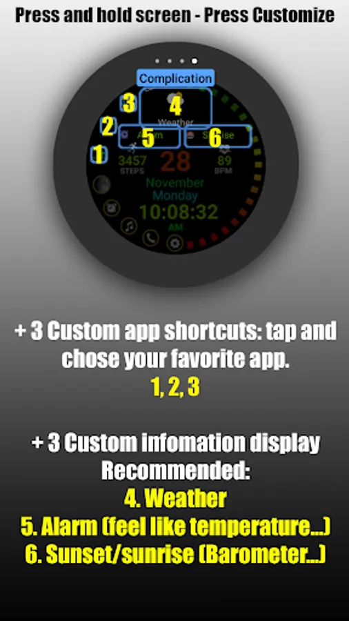 1, 2, 3, custom app shortcuts: set your favorite app, and then on watchface tap to open your app)