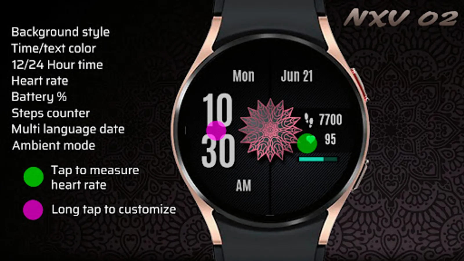 • Background style customization options (long tap watch face to customize)
