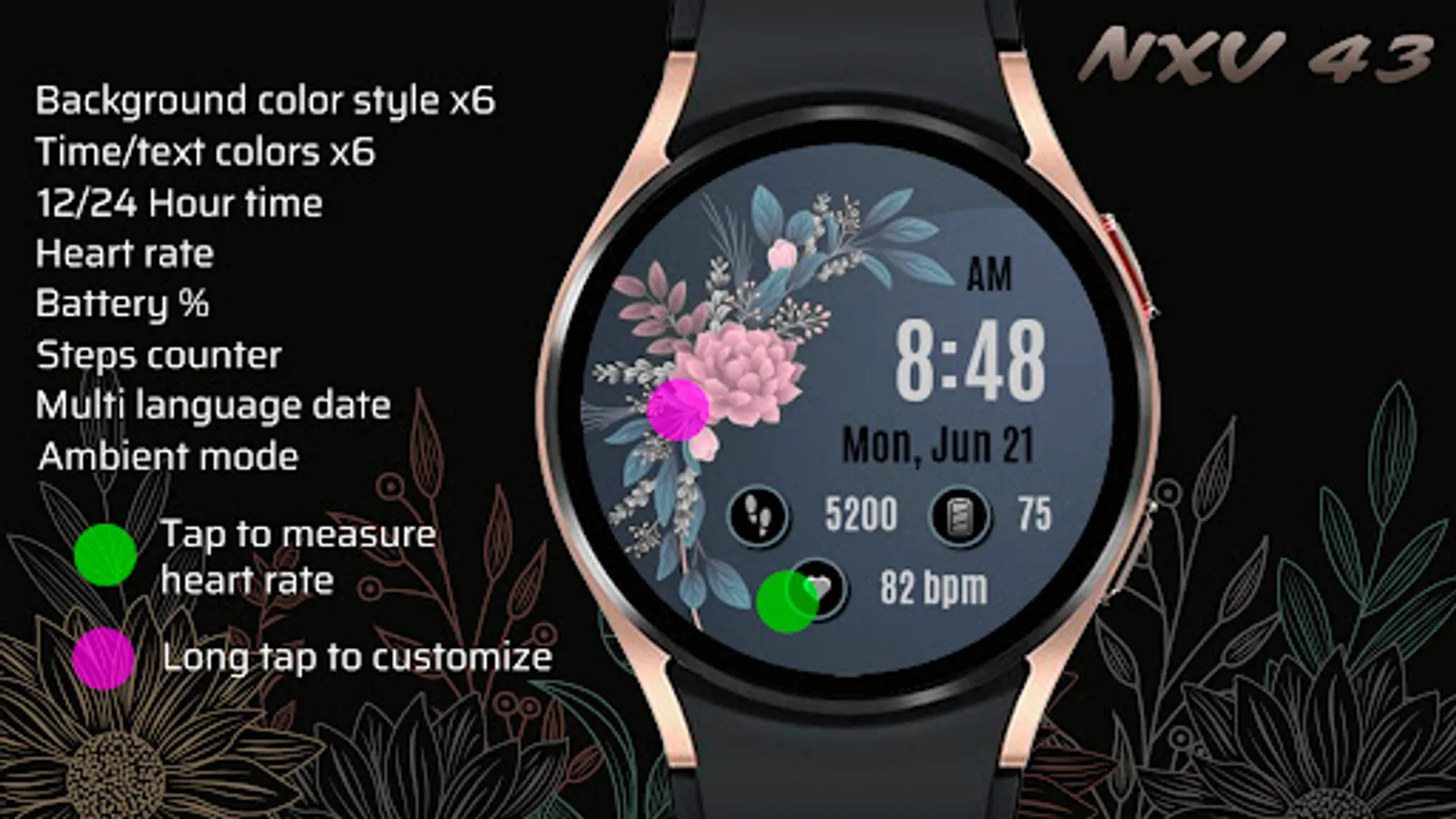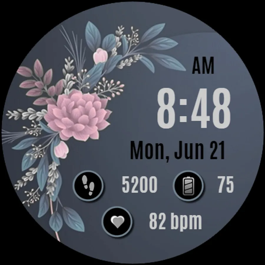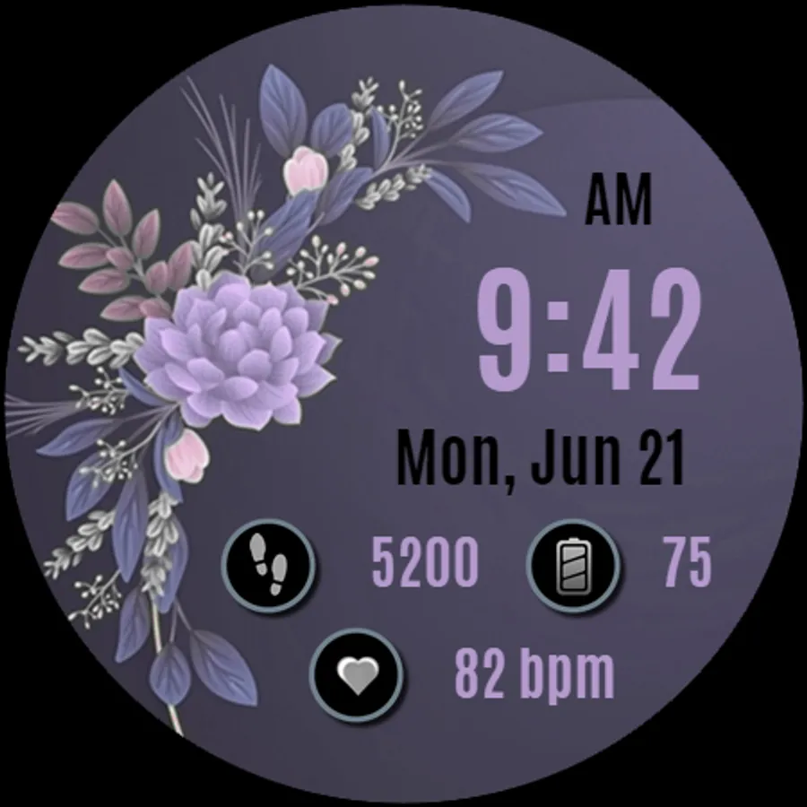 Elegant, vibrant and colorful ladies watch face with the following features:• 6 background color customization options (long tap watch face to customize)