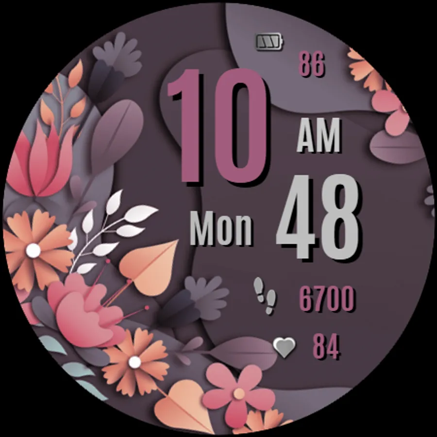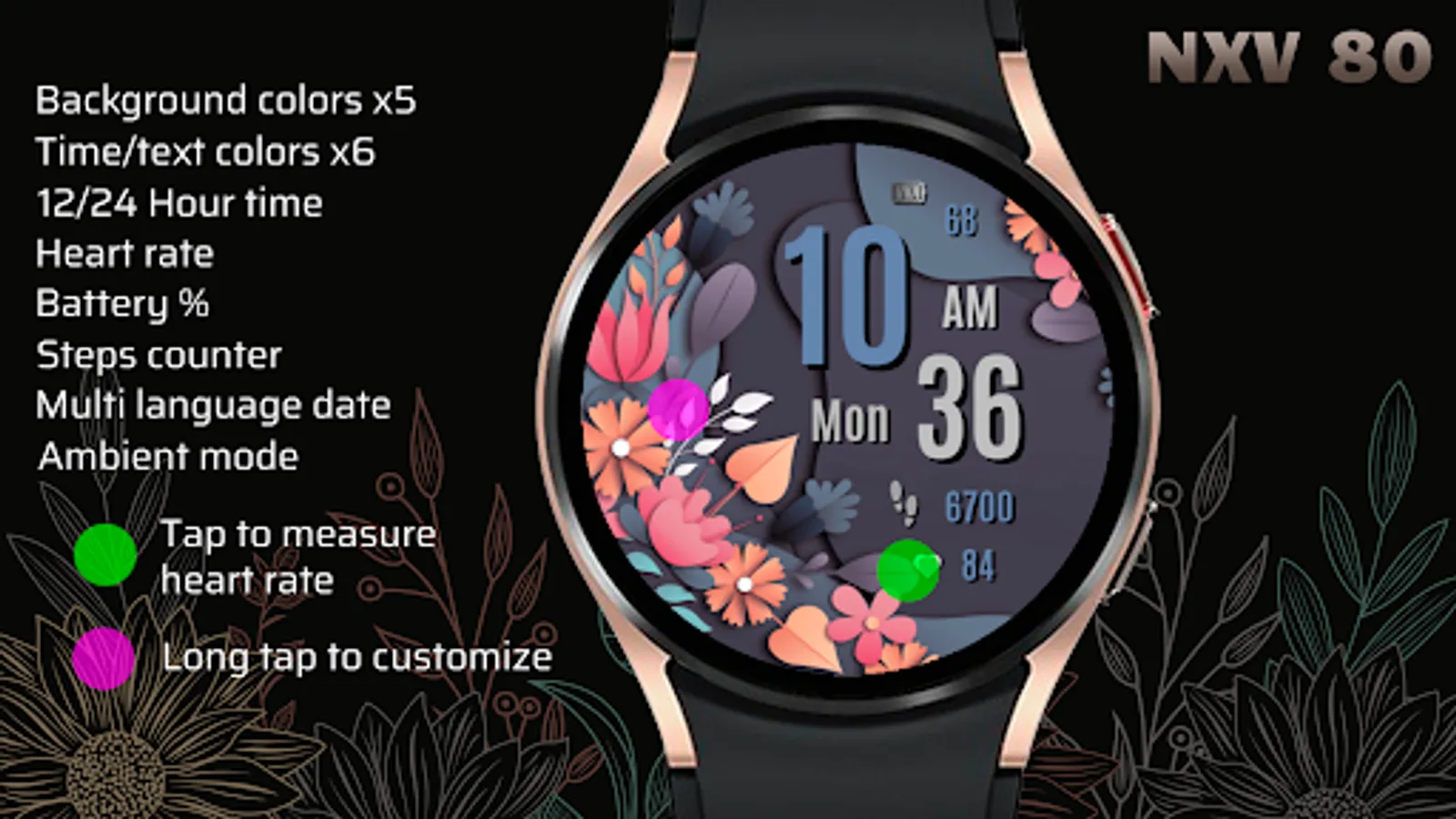 Elegant, stylish and colorful ladies watch face with the following features,• Background color customization options (long tap watch face to customize)